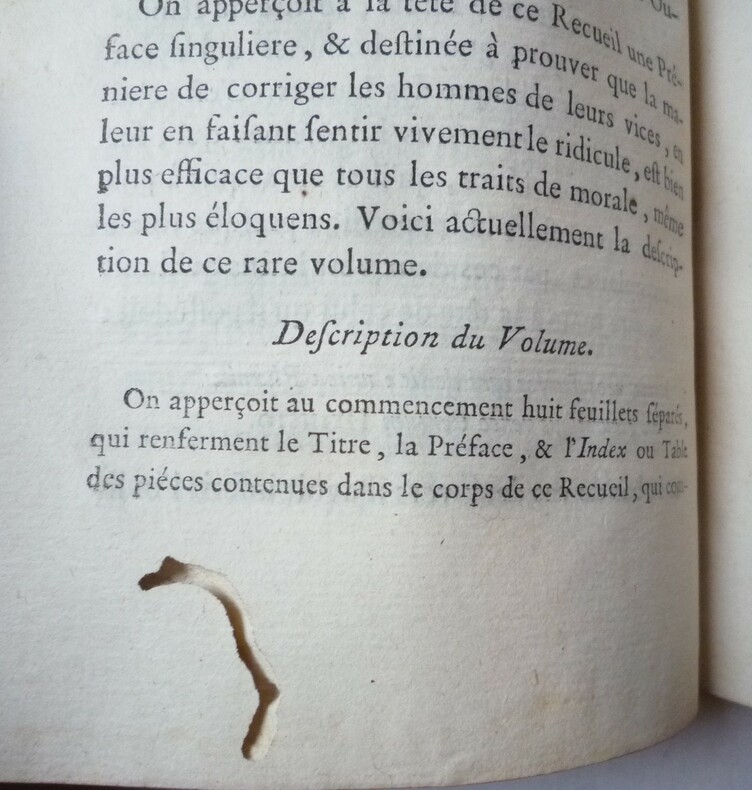 Contenant un catalogue raisonné de la plus grande partie de ces livres précieux, qui ont paru successivement dans la Répulique des Lettres, depuis l'invention de l'imprimerie, jusques à nos jours, avec des notes sur la différence & la rareté de leurs éditions & des remarques sur l'Origine de cette rareté actuelle et son dégré plus ou moins considérable : la manière de distinguer les éditions originales, d'avec les contrefaites, avecune description typographique particulière, du composé de ces rares volumes, au moyen de laquelle il sera aisé de reconnoître facilement les exemplaires, ou mutilés en partie, ou absolument imparfaits, qui s'en rencontrent journellement dans le commerce, et de les distinguer sûrement de ceux qui seront exactement complets dans toutes leurs parties. Classification Dewey : 840.05-XVIII ème siècle