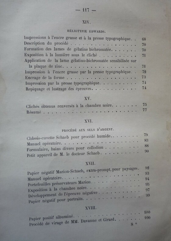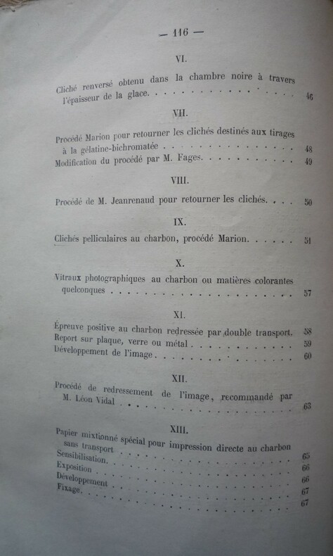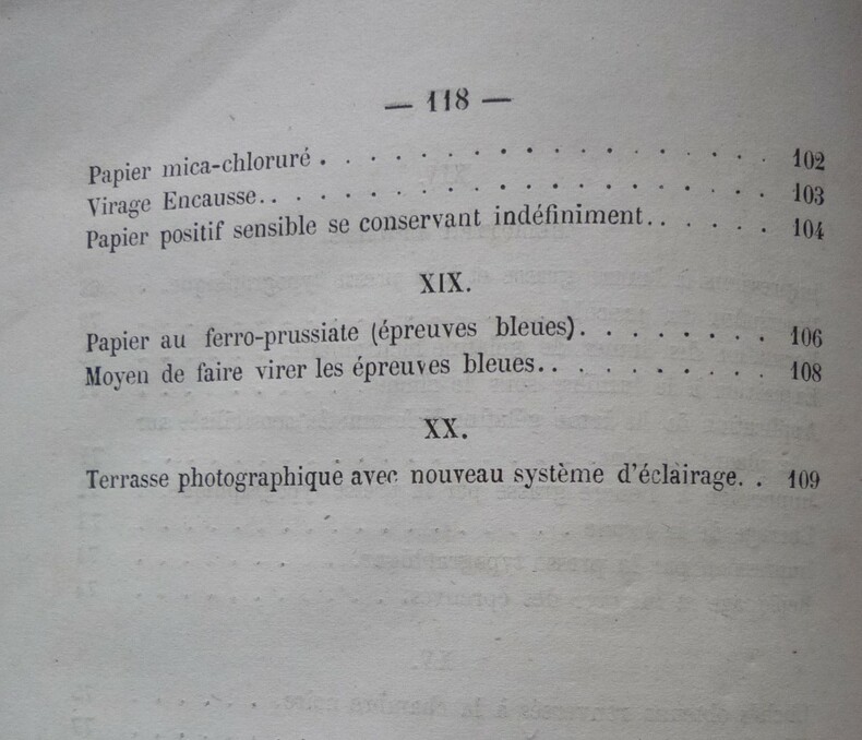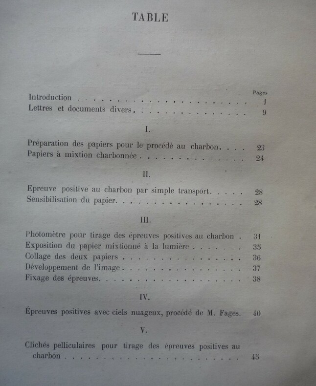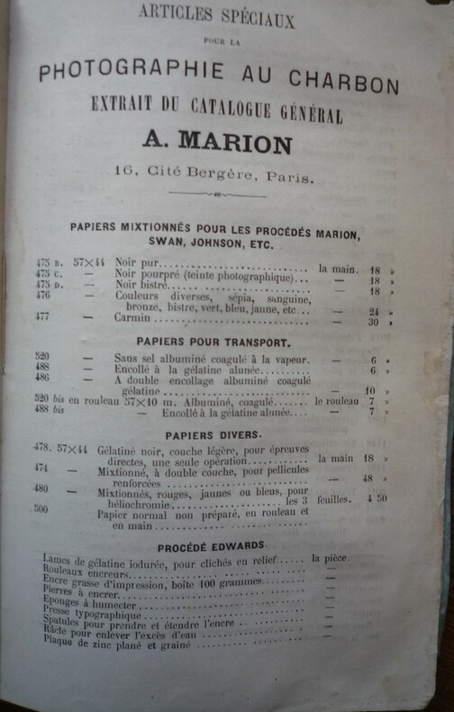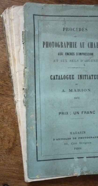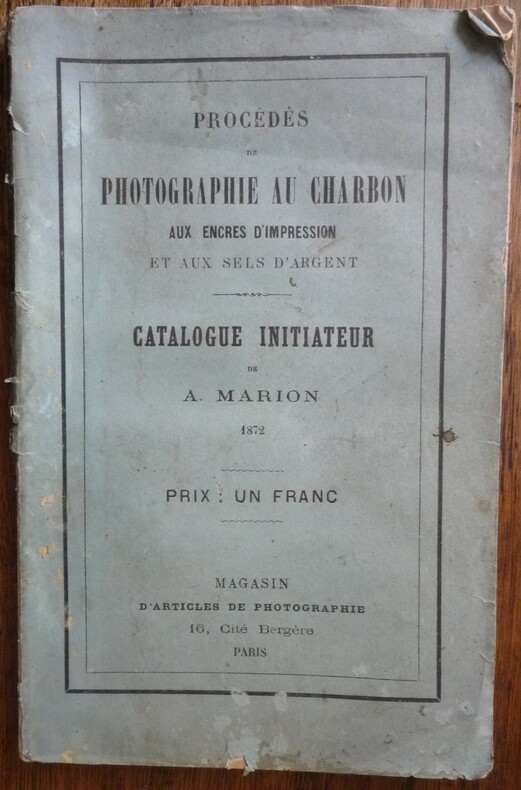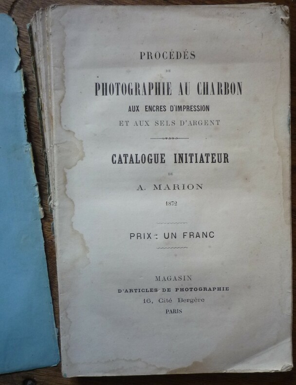 Catalogue initiateur de A. Marion . Au magasin d'articles de photographie, 16, Cité Bergère, Paris - 1872. format : broché, 14 x 21.5 cm, 122 pages. extrait du sommaire : préparation des papiers, épreuve positive au charbon par simple transport, photomère pour tirage des épreuves positives au charbon, clichés pelliculaires pour tirage des épreuves positives au charbon, héliotypie Edwards.... (voir photos de la table) état : débroché, couvertures salies et détachées, une vingtaine de feuillets cornés. L'ouvrage est bien complet.
