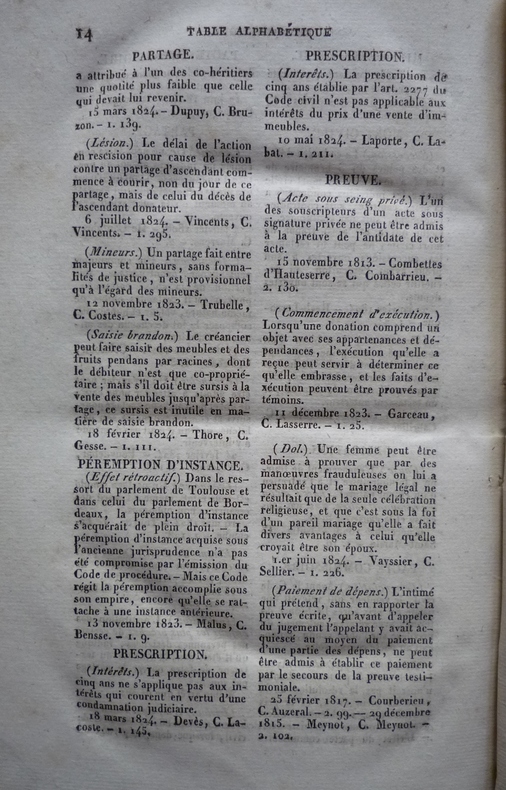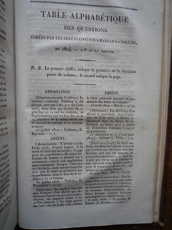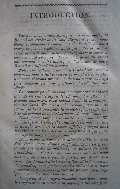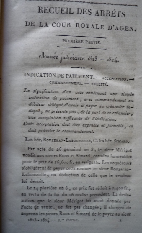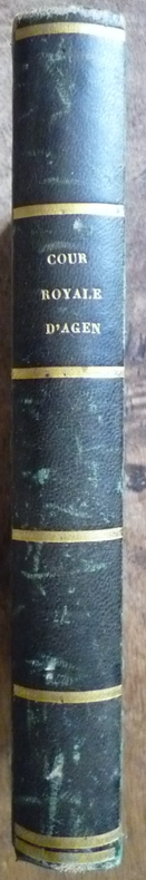RECUEIL DES ARRÊTS DE LA COUR ROYALE D'AGEN publié par MM. BOUET, SENBAUZEL, FAUCON, avocats et BETOUS à AGEN de l'imprimerie de PROSPER NOUBEL - 1824. Format : 13,5 x 20,5 cm, 2 tomes reliés en un volume, 308 pages pour la première partie et 154 pour la seconde plus 18 pages de tables. Reliure demi-basane verte de l'époque, plats marbrés