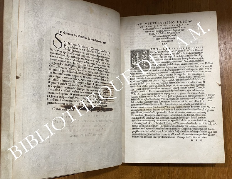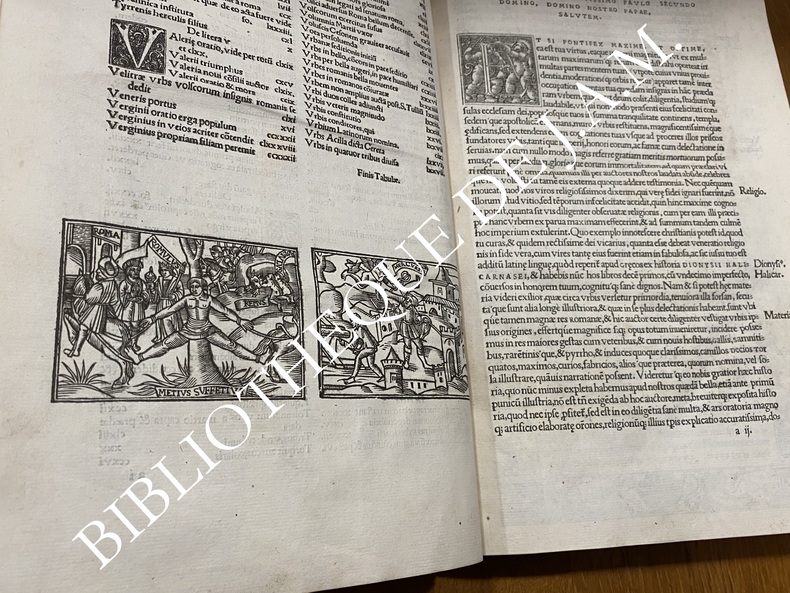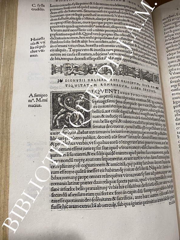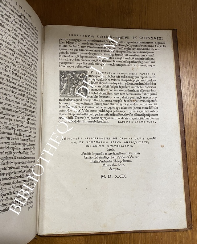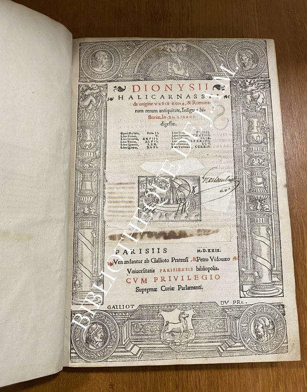 Première édition française, première traduction et édition humaniste latine publiée à Paris. Une des plus anciennes impressions européennes après la princeps. Elle appartient pleinement à la première génération des éditions humanistes parisiennes avec Budé, Josse Bade, et Vidoué comme imprimeur principal du Parlement de Paris. Deux grandes gravures en fin d’index figurent : -Romulus, Remus, Metius Suffetis : scène fondatrice de la royauté romaine, probablement inspirée des planches d’après Raphaël diffusées dans les milieux érudits parisiens. -Mercurius : allégorie de l’éloquence et de la raison, placée ici en hommage au dieu protecteur des écrivains et traducteurs. En marge de la dernière page encadrée figure : Anaxilaus Theopopus – Oratio e animi imago – ESLMI ADM, formule typique des ateliers humanistes, combinant citation grecque et devise latine (“Le discours est l’image de l’âme”). La devise “Vogue Agalee” (voile au vent) apparaît également, emblème d’inspiration nautique symbolisant le progrès des lettres humaines vers la lumière du savoir.