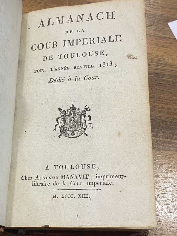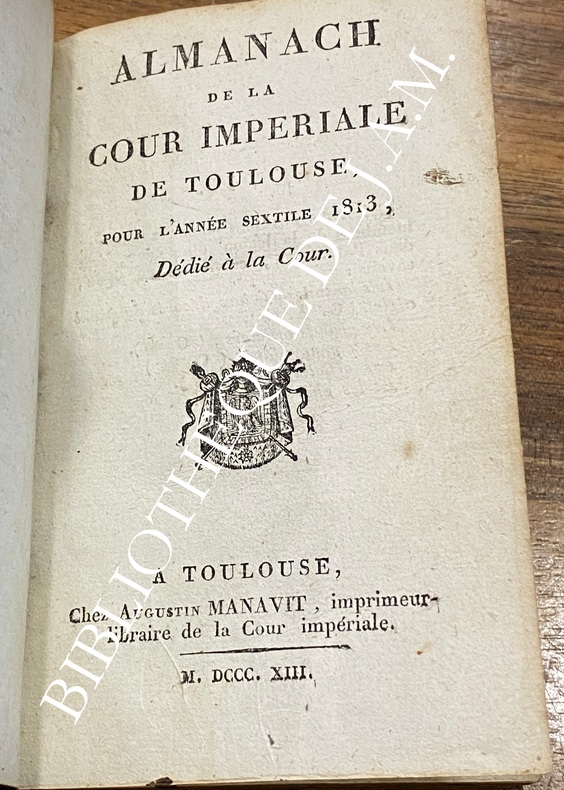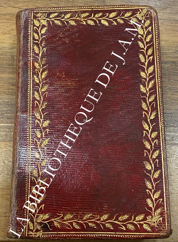 In-16 reliure d'époque maroquin rouge du XIXe siècle, dos lisse orné de fleurons dorés, plats encadrés de guirlandes de blé dorées roulée a froid – (motif symbolique de prospérité agricole et judiciaire sous l'Empire), toute tranches dorée, 259pp. Augustin Manavit- Toulouse. traces d'usage a la reliure et a la dorure, intérieur frais