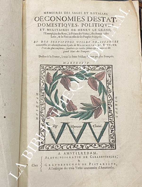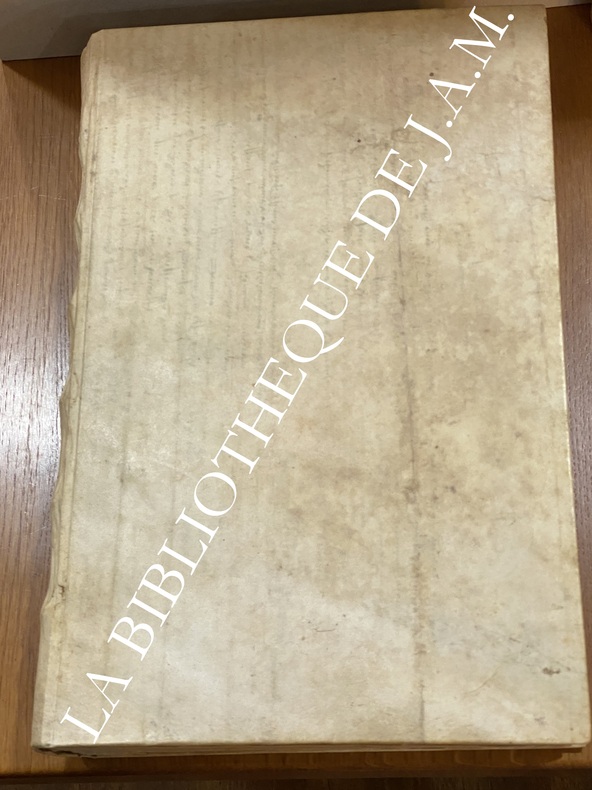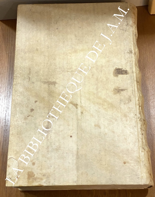 Édition originale : Clandestine, sans date circa1638-1640 adresse fictive « Amsterdam » pour éviter censure. Vignette aux trois vertus (Foy, Espérance, Charité) aquarellée en rouge et vert – souvent plus colorée dans les contrefaçons que dans l’originale, In-folio vélin souple , deux tomes en un volume 535pp tome1 et 439pp tome 2, quelques cul de lampe , quelques défauts eu trace de galerie en marge intérieur, petite restauration plat arrière, trace d 'criture ancienne sur les plats.