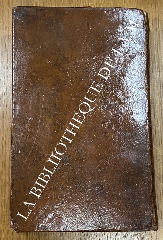 In-12 plein cuir de l'époque, dos lisse titre et fleurons dorés, toutes tranches rouge, 451pp. chez la veuve Girard & François Seguin à la place Saint Didier. Petit manque de papier dans la marge extérieure de la page 39, coins bas émoussés, coiffe du haut absente, petite fissure au mors haut.