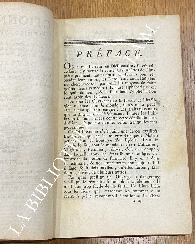 Cet ouvrage est une réponse au "Dictionnaire Philosophique" de Voltaire, même s'il reconnait le talent d'écrivain de ce dernier.