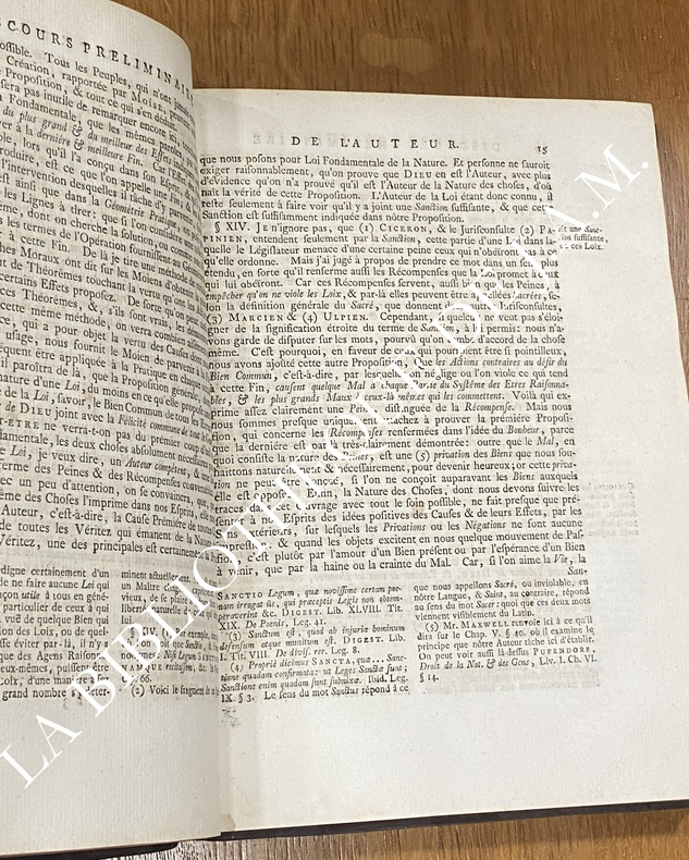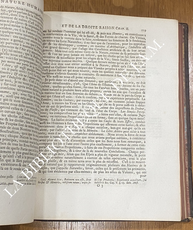 D'après les descriptions bibliographiques détaillées (catalogues comme Brunet V, 589 ; Einaudi n°5506 ; Kress 537), cette édition est typiquement sans frontispice illustré – la page de titre en rouge et noir est suivie directement du texte (préface ou notes de Barbeyrac). Les exemplaires numérisés (ex. : Bavarian State Library, digit. 2009) confirment : pas d'illustration allégorique ou gravée avant le contenu principal.