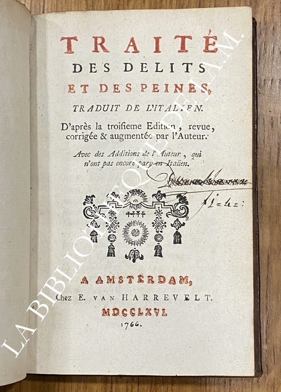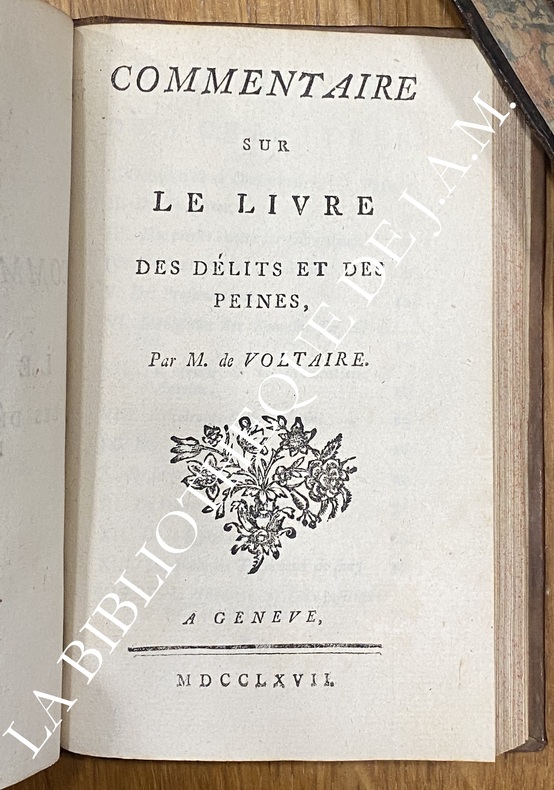 L'exemplaire est complet et dans sa configuration d’origine le Traité avec ajouts + le Commentaire intégral de Voltaire. Une des éditions les plus fidèles et recherchées de 1766, avec les ajouts authentiques de Beccaria. Recueil emblématique des Lumières pénales : Beccaria + Voltaire réunis dans une impression hollandaise tolérante. Influence majeure : fondement du droit pénal moderne (proportionnalité, abolition torture, prévention par éducation). Commentaire de Voltaire : texte ironique et puissant, accélérateur de la diffusion des idées réformistes. Exemplaire complet et bien conservé Beccaria Cesare Né en 1738, mort en 1794, les écrits du marquis Cesare Beccaria relèvent des incontournables du réformisme pénal des Lumières. Éduqué chez les Jésuites de Parme, docteur en droit, il fut scandalisé par le supplice de Jean Calas, dont le fils a été retrouvé mort en 1761. Il s’agissait sans doute d’un suicide, mais le parlement de la ville a aussitôt accusé Jean Calas, protestant, d’avoir tué son fils qui songeait, d’après certaines rumeurs, à devenir catholique. Après un procès empreint de fanatisme catholique, Jean Calas a été condamné à mort et assassiné sur la place publique. Par la suite, grâce à l’indignation de certains (dont Beccaria et Voltaire) face à une condamnation sans véritable preuve, le procès a été révisé et Jean Calas innocenté et réhabilité. Marqué par le libéralisme et la modération de Montesquieu (Esprit des lois, 1748) et le contractualisme de Rousseau, Beccaria critique la pratique de l’excès pénal enraciné dans l’héritage inquisitorial. Beccaria, compagnon de route des philosophes, élargit le problème de la modération pénale en prônant au nom des Lumières la suprématie de la raison, l'éducation populaire et la sécularisation des normes morales pour les droits de l'homme. Homme d'un seul livre d'importance publié pour la première fois en langue italienne à Livourne, chez Coltellini, en 1764, alors qu’il n’a que vingt-six ans, il propose un nouveau paradigme du droit de punir. Il récuse la tradition pénale romaine et prône l'abolition du gibet, réclame la décriminalisation du suicide et de l'homosexualité et propose de remplacer l'arbitraire des délits et des peines par leur légalité. Le crime est pour lui moins un péché qu'une infraction sociale, aussi la peine ne doit-elle pas être la rétribution expiatoire du péché. Déjà en 1764, il réclame sine die l'abrogation de la peine capitale qui n'a jamais « rendu les hommes meilleurs » et dont la « cruauté » est socialement nuisible dans un livre qui n’est alors pas signé, par crainte de représailles. “Si je prouve que cette peine n’est ni utile ni nécessaire, écrit Beccaria, j’aurai fait triompher la cause de l’humanité.” Le succès de l’ouvrage de Beccaria conduira des souverains éclairés, tel le grand-duc Pierre-Léopold de Toscane, à s'en inspirer lorsqu’en 1786 il supprime la peine capitale. Aux États-Unis, l'ouvrage inspire les pères fondateurs de la démocratie américaine. En France, les rédacteurs du Code pénal (1791) le suivent partiellement en abolissant les supplices, en généralisant le système carcéral comme institution démocratique de la pénalité en République, tout en maintenant la peine capitale. Adulé ou combattu, Beccaria est à l’origine du régime pénal de l'État de droit né de la Révolution qui trouve son prolongement dans l’abolition de peine capitale au sein de tous les pays de l'Union européenne et la consécration d’un droit criminel respectueux des droits de l'homme, loin des dérives sécuritaires. Dès 1766 Voltaire adhère au réformisme beccarien. Le commentaire sur le livre Des délits et des peines qu’il réalise est publié à Genève en 1767. Ce commentaire est joint à l’ouvrage de Beccaria traduit à Trois éditions de l’ouvrage de Beccaria furent épuisées en six mois. La troisième édition, parue au début de 1765 – avec l’indication du lieu d’édition fictif de Lausanne – fut traduite en français par l’abbé Morellet, sur les instances de d’Alembert, qui la lui avait remise. D’Alembert avait écrit, le 9 juillet 1765 : « Ce livre, bien que de format petit, suffit à assurer un nom immortel à son auteur. Quelle philosophie ! Quelle vérité ! Quelle logique ! Quelle précision et en même temps quelle humanité dans son œuvre ! » (cité par Paul-Emile Schazmann, « Le Traité des délits et des peines en Suisse », Revue Pénale Suisse, 1943, p. 67). « Un livre où l’on plaide la cause de l’humanité, une fois devenu public, appartient au monde et à toutes les nations », avait justement proclamé l’abbé Morellet dans sa Préface. Avant la traduction française de Morellet, une traduction polonaise (anonyme) avait paru, en 1762, et une traduction allemande, en 1765 (cf. Stefan Glaser, « Beccaria et son influence sur la réforme du droit pénal », Revue internationale de droit pénal, vol. 5, 1, 1928, p. 429). Brissot de Warville et Diderot l’annotaient, et Voltaire en donnait un Commentaire presque aussi célèbre que l’original. Le Commentaire de Voltaire est publié à la suite même du traité de Beccaria, dont il semble inséparable. C’est en se dissimulant – sous le nom de « M. Cassen, avocat au Conseil du Roi » – que Voltaire, la même année, adresse à M. le marquis de Beccaria sa Relation de la mort du chevalier de La Barre, et qu’il publia, sans nom d’auteur ni de lieu et sans date, son Commentaire sur le livre des Délits et des peines, par un Avocat de province, imprimé clandestinement par Cramer, à Genève.