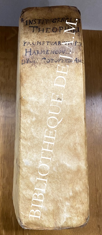 In-quarto, 2 parties en 1 volume : [viii] + 308 pp. + [viii] + 329 pp. + Index, Plein vélin d'époque, à rabats, dos lisse titre manuscrit, Galerie en marge basse sur plusieurs cahiers, quelques rousseurs. manque les lacets , tache et petites fissures sur les plats , petites fissure au plat arrière Guillelmum Laemarium, Genève.