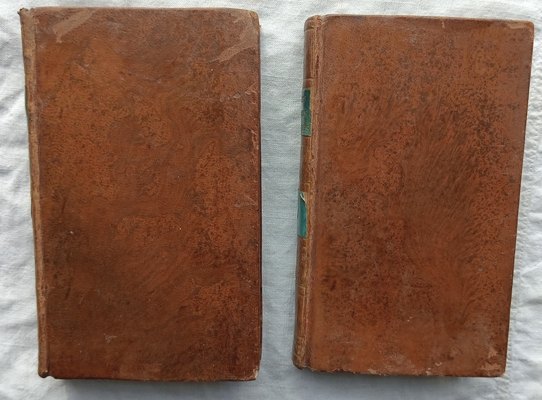 2 vol, in-18 (10,5 cm X 17,3 cm), 424 pp + 398 pp, reliure plein cuir, dos lisse, décoration et pièce de titre et de tomaison cuir vert sur le dos, tranches marbrées.