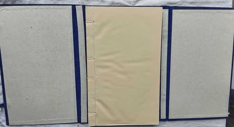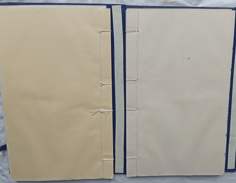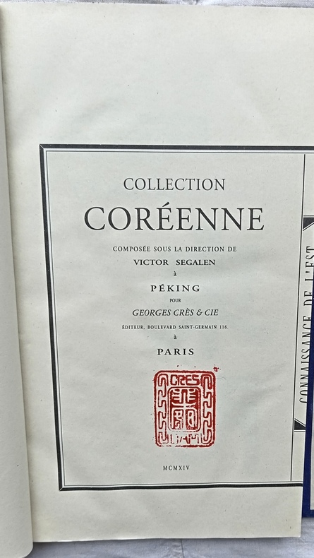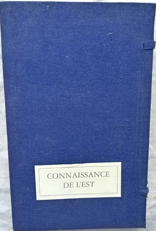 édition à 500 exemplaires, fac-similé de l’édition parue pour Georges Crès à Paris en 1914 dans la "Collection Coréenne", composée à Pékin sous la direction de Victor Ségalen. Sous double chemise en percaline bleu nuit avec fermoirs en os, étiquette de titre contrecollée sur le premier plat, 2 vol, 17,2 cm X 28,4 cm, pages non coupées en gouttière et pliées "en portefeuille" reliées par un fil de lin.
