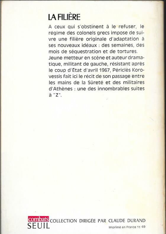 La filière. Témoignage sur les tortures en Grèce. (Paris: Editions du Seuil, 1969) [M.C.: Grèce histoire moderne]