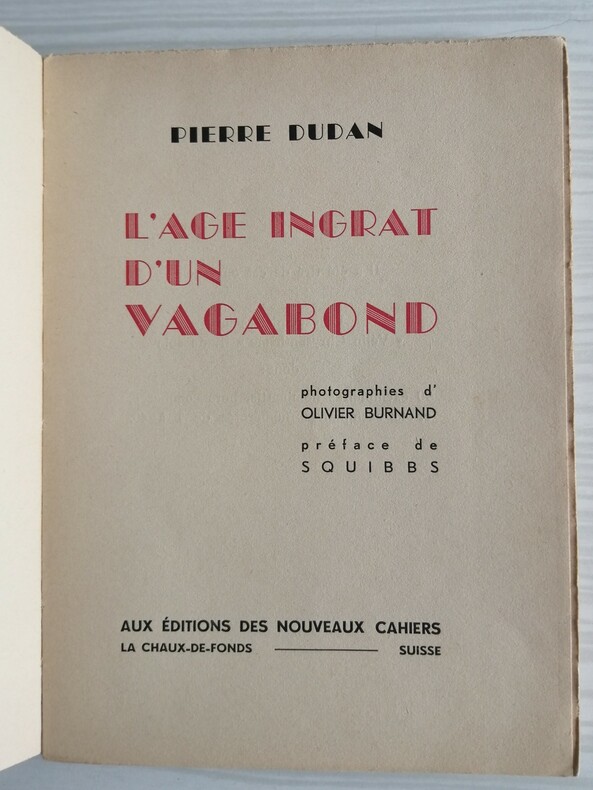 La Chaux-de-Fonds, Editions des Nouveaux Cahiers, 1942. In-8°, 145 p., avec photographies hors-texte d'Olivier Burnand, couverture illustrée. Edition originale, un de 90 ex. num. sur "Vélin Chrysanthème" fil de soie avec dedicasse manuscrite sur le faux titre.