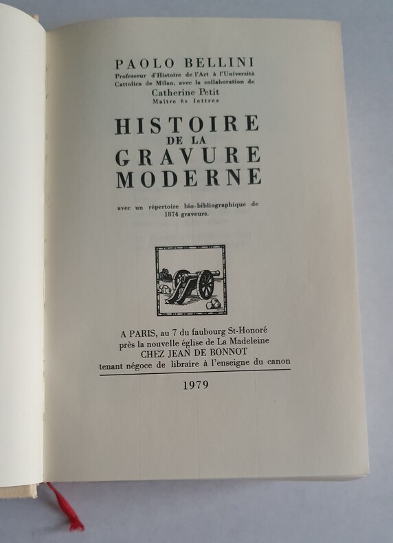Editions Jean de Bonnot 1980. In-8 fort cartonnage éditeur de 540 pages au format 21 x 5,5 x 14 cm. Couvertures et dos rond illustrées par une estampe originale numérotée et signée n° 13 sur 333 par Ingo Avolta. Tête dorée. Signet. Plats avec bords légèrement brunis. Petit tassement aux coins inférieurs droits. Intérieur frais. Excellente histoire de la gravure moderne par Paolo Bellini avec bandeaux de Ingo Avolta, avec un long chapitre consacré au Surréalisme. Répertoire bio-bibliographique de 1874 graveurs, avec de nombreuses illustrations hors texte. Un des 333 exemplaires du tirage de tête avec estampe originale, numérotée et signée en couverture, par Ingo Avolta + signature de Jean de Bonnot en fac-similé autographe et certificat d'authenticité. Très bel état général. Rare édition originale surtout avec l'estampe dite " aux personnages ".