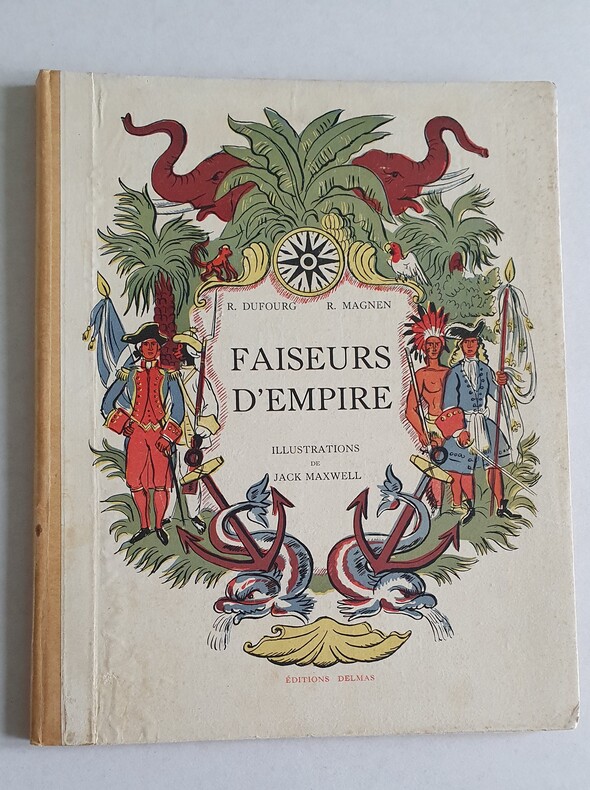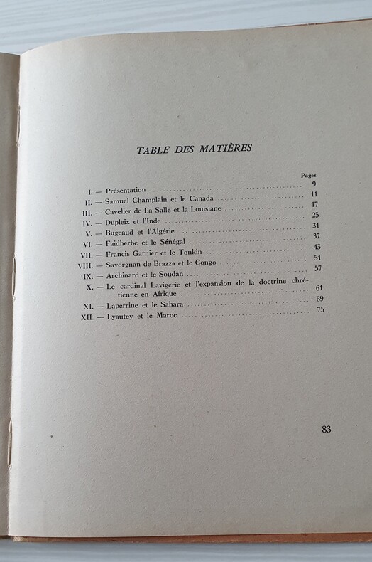 Editions Delmas, Bordeaux 1945 - Illustrations de JACK MAXWELL - In-4 (27x21 cm), relié, cartonnage illustré en couleurs, 83 pages. - Table des matières: I - Présentation. II - Samuel Champlain et le Canada. III - Cavelier de La Salle et la Louisiane. IV - Dupleix et l'Inde. V - Bugeaud et l'Algérie. VI - Faidherbe et le Sénégal. VII - Francis Garnier et le Tonkin. VIII - Savorgnan de Brazza et le Congo. IX - Archinard et le Soudan. X - Le cardinal Lavigerie et l'expansion de la doctrine chrétienne en Afrique. XI - Laperrine et le Sahara. XII - Lyautey et le Maroc. - L'ouvrage est en bon état.
