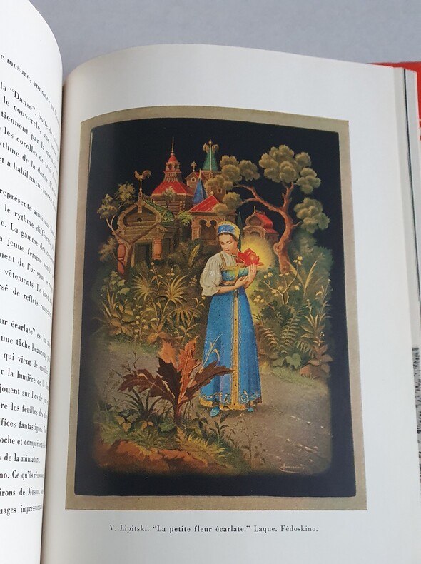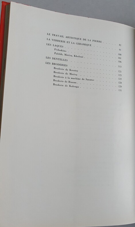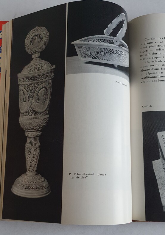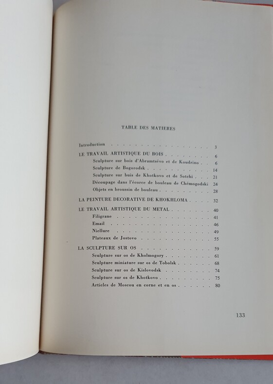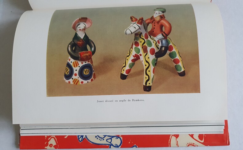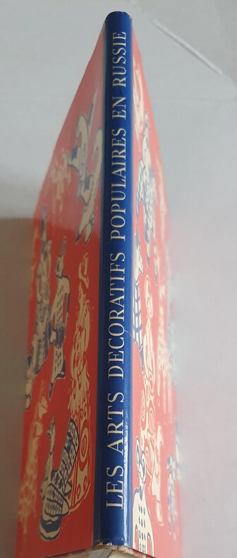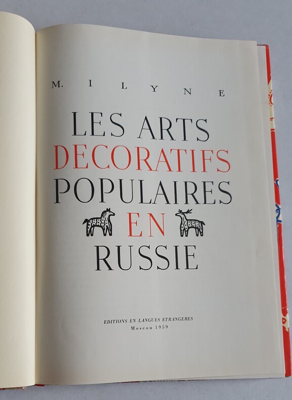 Editions en langues étrangères. Moscou 1959, in-8° cartonnage éditeur décoré sous jaquette illustrée. Petit historique illustré des arts décoratifs russes : travail du bois, du métal, sculpture sur os, travai de la pierre, verrerie et céramique, laques, dentelles, broderies . etc.