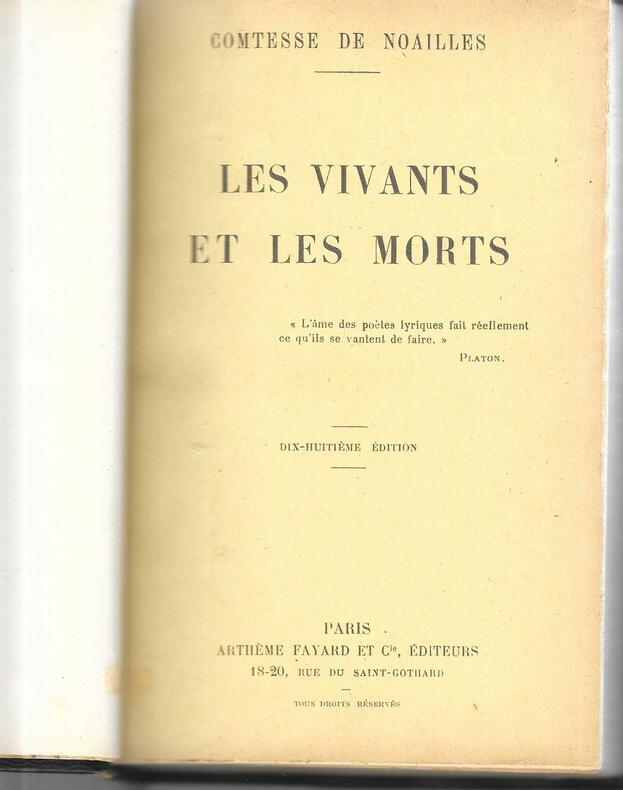 "Les Vivants et les Morts" d'Anna de Noailles, offre une méditation poétique sur la vie et la mort. À travers une plume élégante et émouvante, l'auteure explore les contrastes entre la vitalité de l'existence et l'inéluctabilité de la fin. Les poèmes révèlent une profonde réflexion sur la condition humaine, évoquant les joies, les peines, les espoirs et les désillusions. Anna de Noailles, avec son style caractéristique, crée une œuvre lyrique qui transcende le temps, capturant l'essence même de l'existence. "Les Vivants et les Morts" demeure un témoignage intemporel de la sensibilité et de la vision artistique d'Anna de Noailles. Poésie, vie, mort, contraste, condition humaine, émotions, espoirs, désillusions.. vol. in-8, 180x120, relié demi cuir, dos lisse, frotté, tranche de tete dorée, 352 pages, ex libris Comte de Noailles couvertures d'origines conservées, bel état, bel exemplaire ! rare Paris Arthème Fayard vers 1913 ref/177