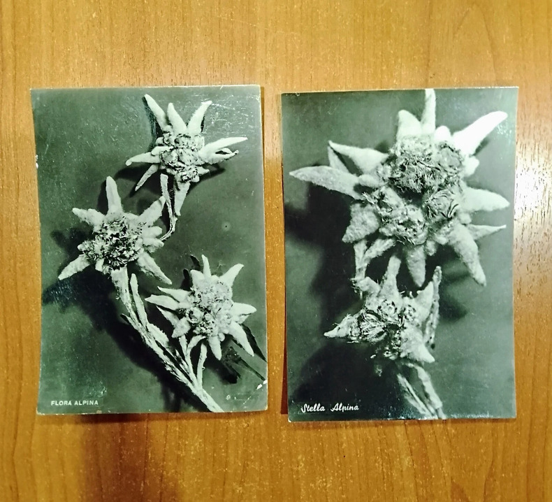 lot de 2 CARTES POSTALES Edelweiss noir et blanc, bon état général, Flora Alpina non écrite, Stella Alpina écrite et voyagée, format 10x15 environ, traces d'usure