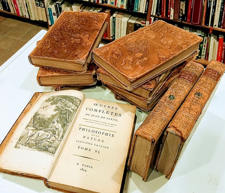 livres anciens œuvres complètes de Jean de Sales, paris 1804, philosophie de la nature, septième Edition, 10 tomes en l'état, usure de coins et de tranches (tome 1 couverture détachée mais présente) traces de jaunissement, envoi colissimo