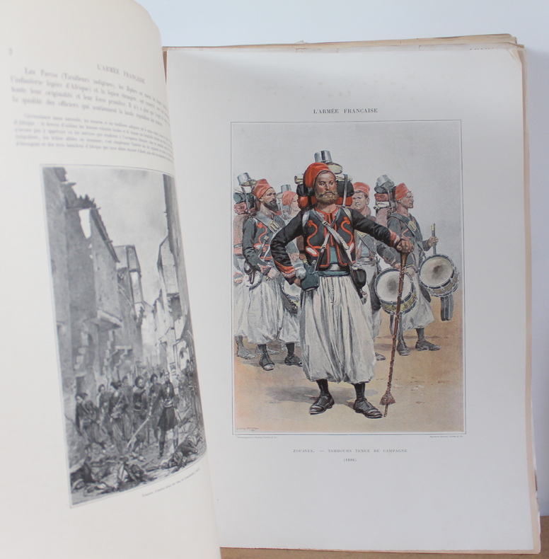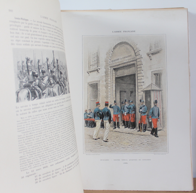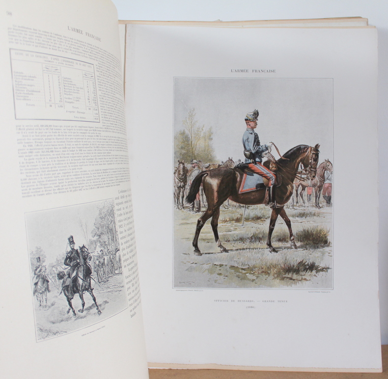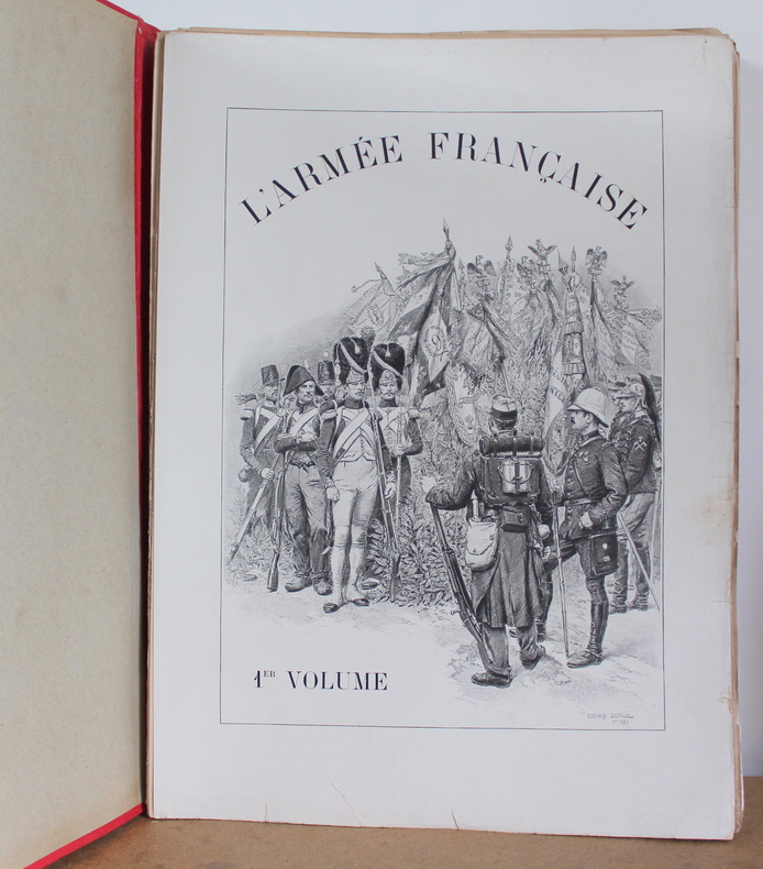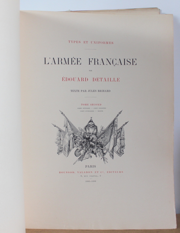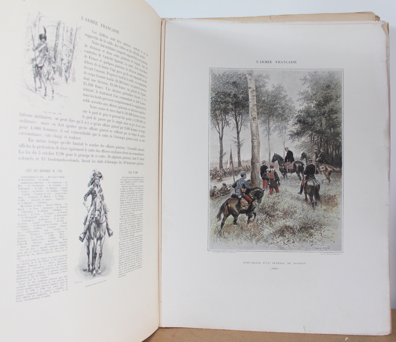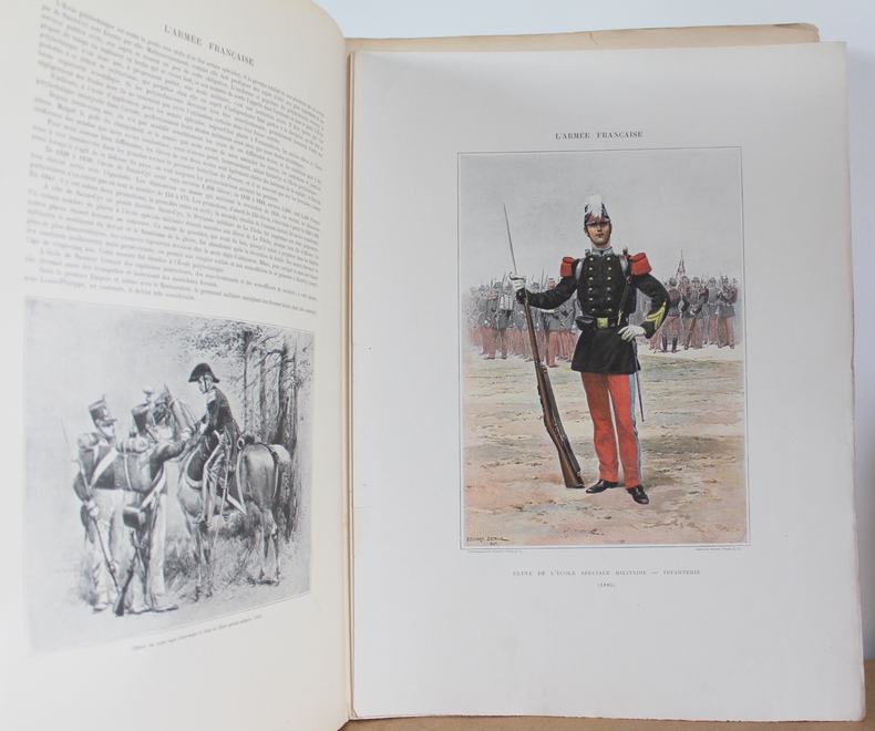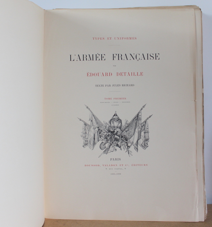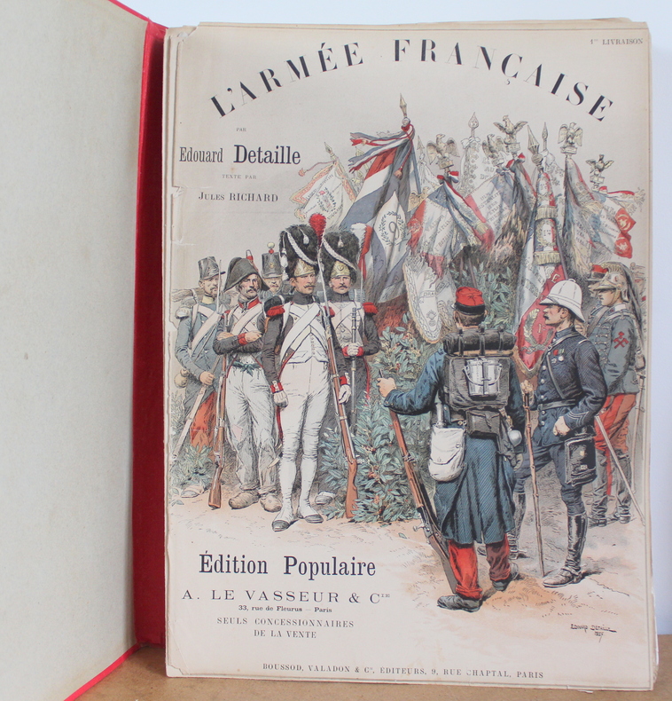 L'armée française États Majors, Écoles, Cavalerie, Infanterie, Tome premier et deuxième COMPLET d'Édouard Detaille, texte par Jules Richard chez Boussod, Valadon et Cie, Éditeurs, Types et uniformes en 1885-1889.Édition originale. Les livres sont illustrés de 2 frontispices, 60 planches couleurs hors texte, 285 illustrations noir et blanc dans le texte. Les livres mesurent 37x47 cm et pèsent 8 kg (c) pour 128 116 pages. En feuille sous chemise correspondant aux 16 livraisons (couverture conservé), chacune comprenant 16 pages de texte et 4 pages hors texte . Les livre sont en bon état, de nombreuses pages ont les bords pliés, déchirés froissés, couverture tachée.