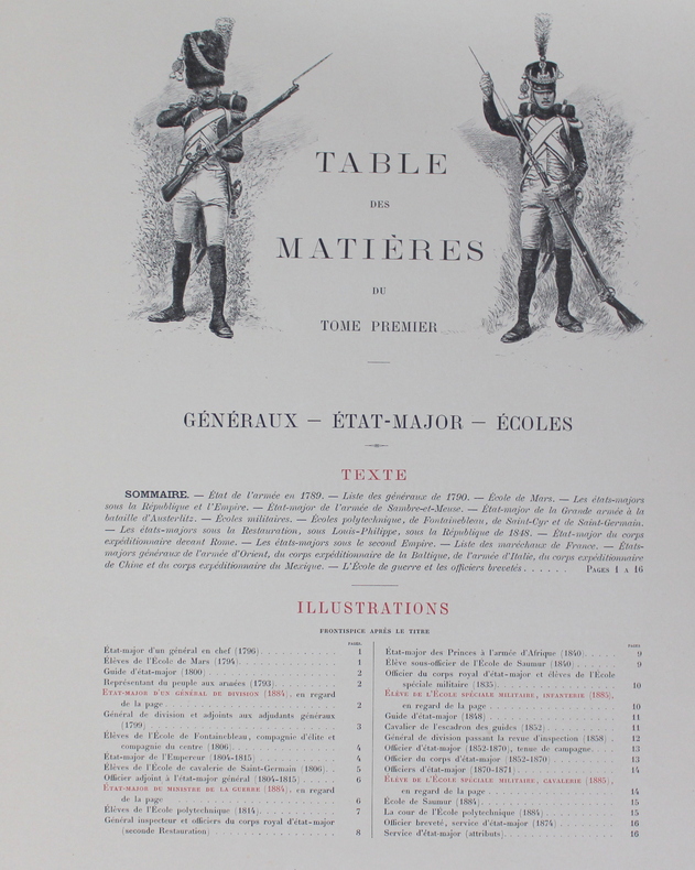 Tome premier: généraux , état major , écoles , histoire de l' infanterie , histoire de la cavalerie Tome second : histoire des troupes de l’armée d'Afrique, histoire de l'artillerie , histoire du génie , histoire de la gendarmerie , histoire de l' administration , histoire des troupes de la marine