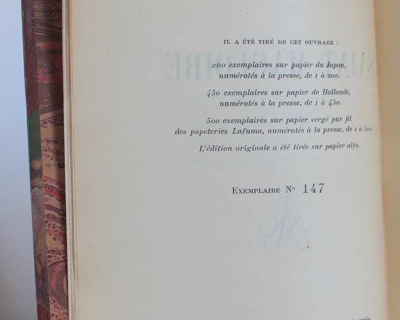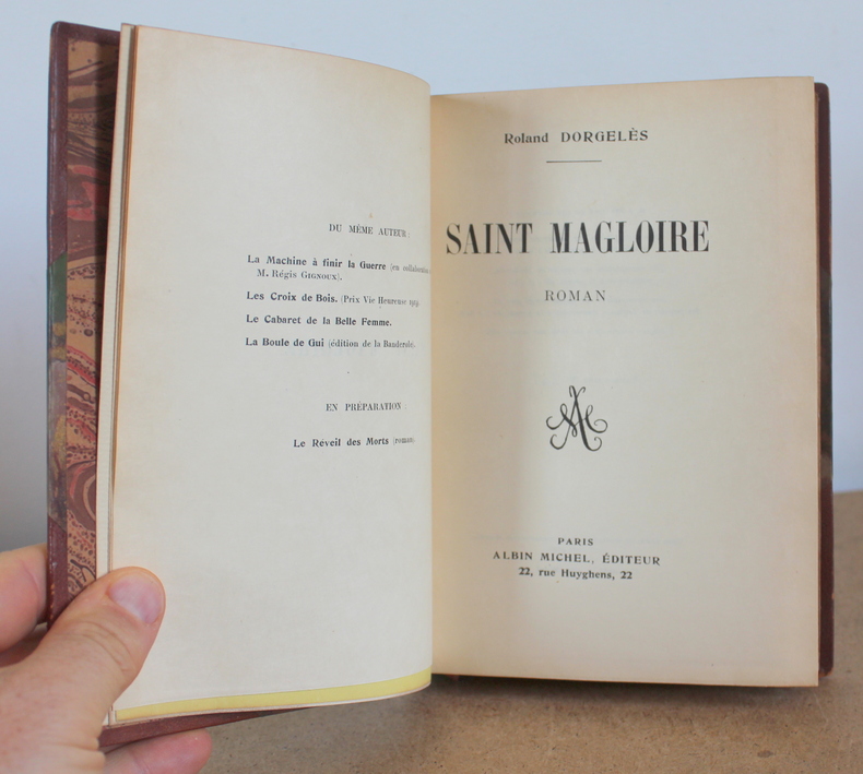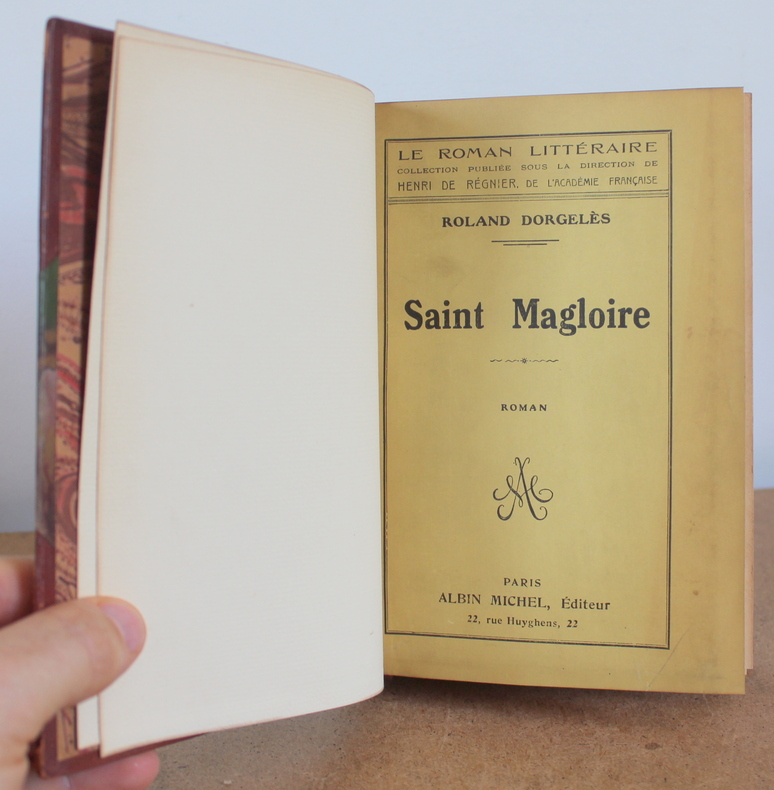 Saint Magloire Roman de Roland Dorgelès chez Albin Michel, Éditeur, Le roman littéraire en 1922. Édition originale numérotée 147/200/1150 sur japon, Grandes marges. Le livre mesure 14x20 cm et pèse 0,600 kg (c) pour 379 pages. Reliure d'époque cartonnée. Le livre est en très bon état, frottis, légère odeur de tabac.