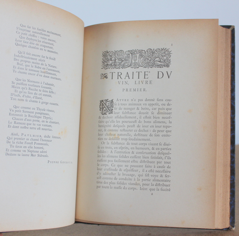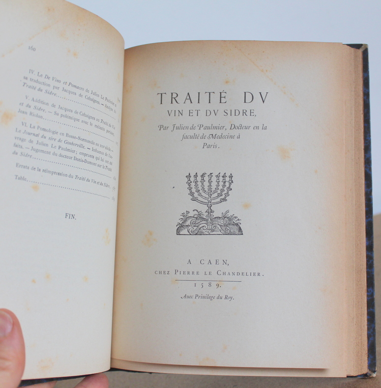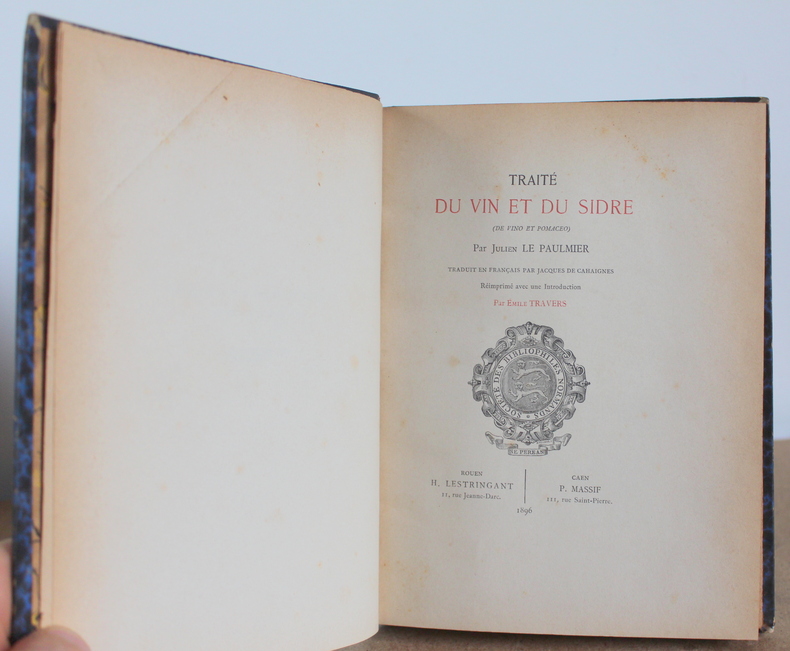 Traité du vin et du sidre (De vino et pomaceo) de Julien Le Paulmier, traduit en français par Jacques De Cahaignes, Réimprimé avec une Introduction par Émile Travers chez H. Lestringant et P. Massif en 1896. Édition numérotée 71/200. Le livre mesure 16x21 cm et pèse 0,700 kg (c) pour 160 87 pages. Reliure d'époque cartonnée. Le livre est en très bon état, rousseurs éparses, plusieurs pliures de lecture, dos insolé.