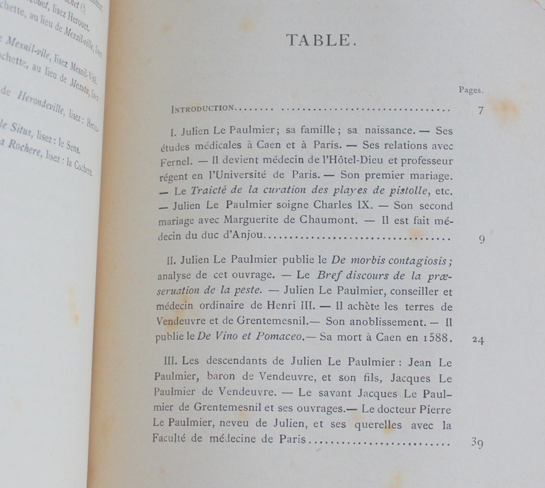 INTRODUCTION Le De Vino et Pomaceo, de Julien Le Paulmier, et la traduction de cet ouvrage, donnée sous le titre de Traité du Vin et du Sidre, par Jacques de Cahaignes, ont obtenu dans leur temps un succès mérité. Ces volumes, devenus rarissimes, sont de nos jours curieusement recherchés par les bibliophiles ainsi que par tous ceux qui, depuis de longues années déjà, se préoccupent des perfectionnements à apporter à la culture des pommiers et à la fabrication du cidre, ou qui étudient les effets hygiéniques d'une boisson dont l'usage tend à se généraliser. C'est, en effet, au livre du médecin normand, vieux de plus de trois siècles, que les traités modernes d'agriculture ou de pomologie ont emprunté presque toujours ce qu'ils ont dit des origines du cidre, des anciennes variétés de fruits, des propriétés du breuvage tiré des pommes; c'est chez lui aussi que des praticiens éminents ont puisé quelques-unes de leurs théories sur l'emploi du cidre pour le traitement de certaines affections. Mais les uns et les autres ont souvent recherché en vain les textes de Julien Le Paulmier et de son translateur; ils ont dû se borner à en citer quelques passages de seconde main, et par conséquent avec des chances d'inexactitude. En rééditant le Traité du Vin et du Sidre, en livrant au public une réimpression fac-simile de l'ouvrage presque introuvable de Julien Le Paulmier, la Société des Bibliophiles normands ne se borne pas à satisfaire le goût des amateurs de livres précieux; elle fournit à l'une des industries agricoles les plus importantes de la Normandie et d'une partie de la France des éléments d'information d'une haute valeur. Tout en restant fidèle à son programme, elle rend donc service à des intérêts de premier ordre et fait acte de patriotisme, au moins local. Bibliophiles et cultivateurs lui en sauront gré. Avant de parler de l'ouvrage, il convient de dire ce que furent l'auteur et le traducteur. Je ne puis parler ici aussi longuement qu'il le faudrait sans doute, de Julien Le Paulmier et de Jacques de Cahaignes, de leur vie, de leurs œuvres et de leurs familles qui, l'une et l'autre, comptèrent plusieurs générations d'hommes de mérite. J'entrerai cependant au sujet des Le Paulmier dans des détails qui, je l'espère, ne seront pas jugés inutiles.