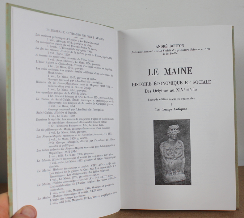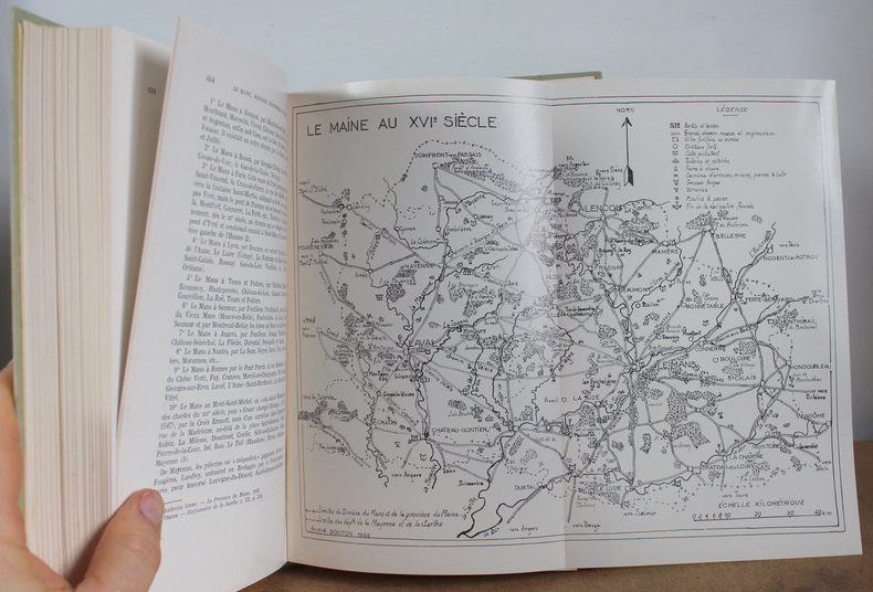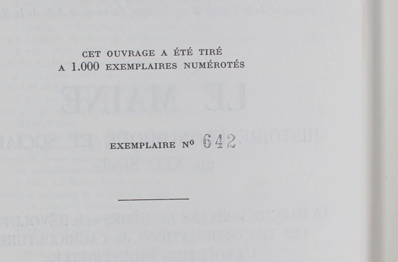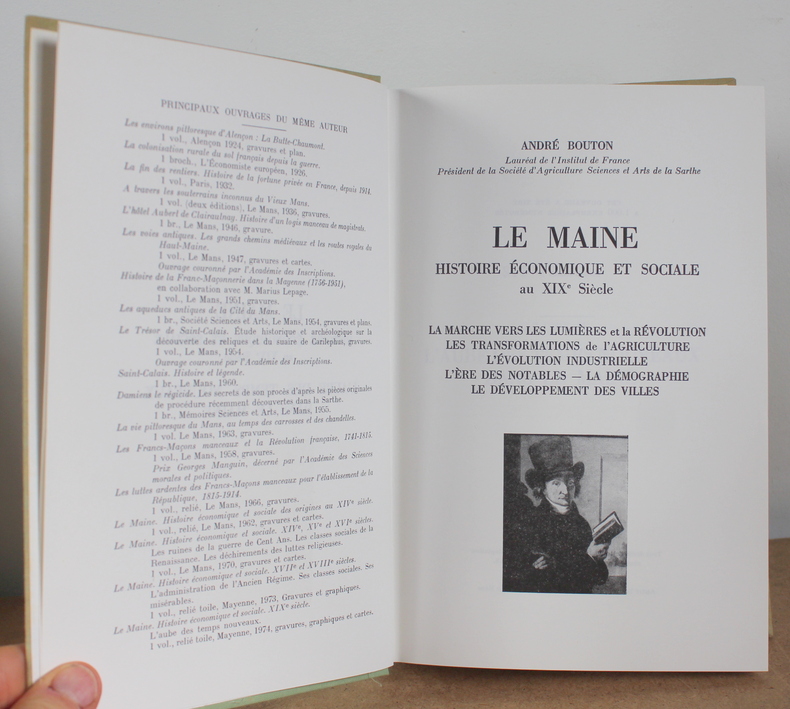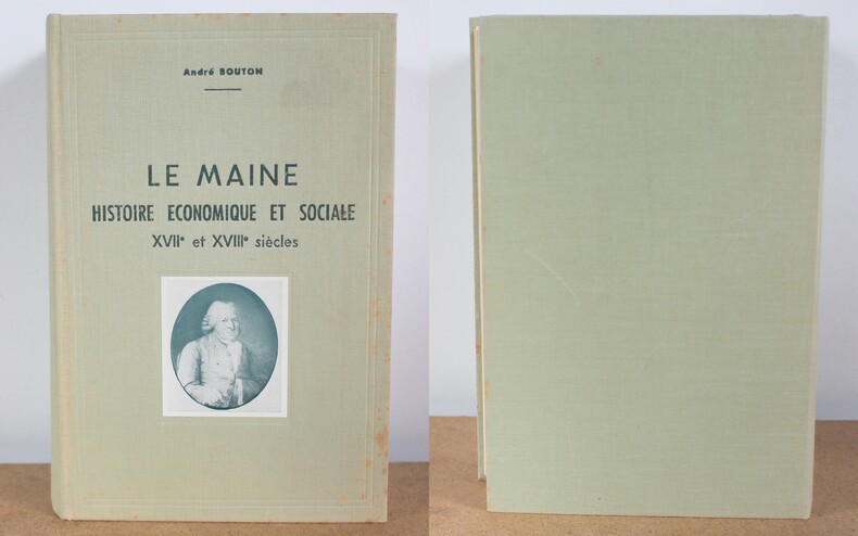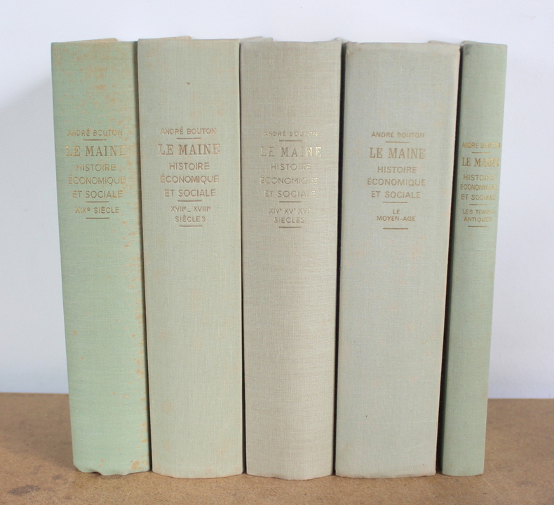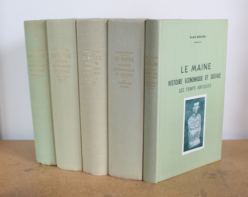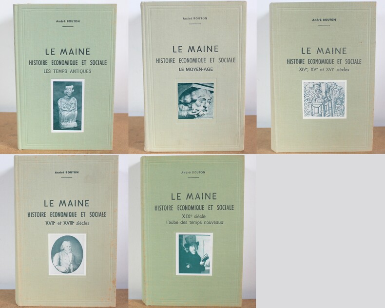 Le Maine, Histoire économique et sociale, 5 tomes COMPLET de André Bouton aux Imprimeries Monnoyer en 1971/.../76. Édition originale numérotée 496 403 930 783 642 sur 1000. Les livres sont illustrés de 160 planches hors-texte dont deux en couleur, nombreux documents, portraits, cartes, gravures, fac-similés, nombreuses figures dans le texte. Les livres mesurent 16x25 cm et pèsent 7 kg (c) pour 1038 661 559 220 758 pages. Reliure d'éditeur cartonnée. Les livre sont en très bon état, un petit mot manuscrit, des rousseurs sur les couvertures.