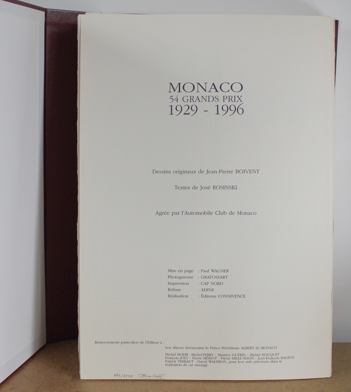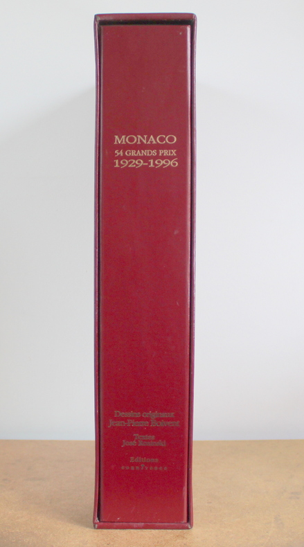 Monaco 54 Grands Prix 1929–1996, Agrée par l'Automobile Club de Monaco de José Rozinski aux Édition Connivence en 1997. Édition originale numérotée 491/1000 signée par Boivent. Le livre est illustré de 62 planches de Jean-Pierre Boivent dont les planches des années 1997 et 1998, ainsi que les trois portraits de pilotes (Stewart, Cevert, Beltoise). Le livre mesure 30x44 cm et pèse 8 kg, non paginé. Le livre est en état d’usage, très bon, plusieurs accrocs sur l’emboîtage.