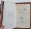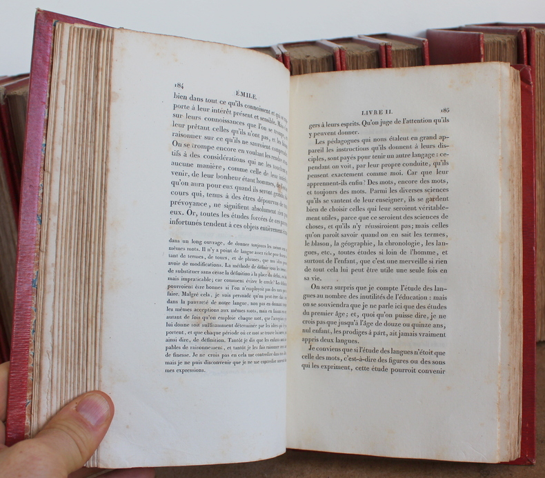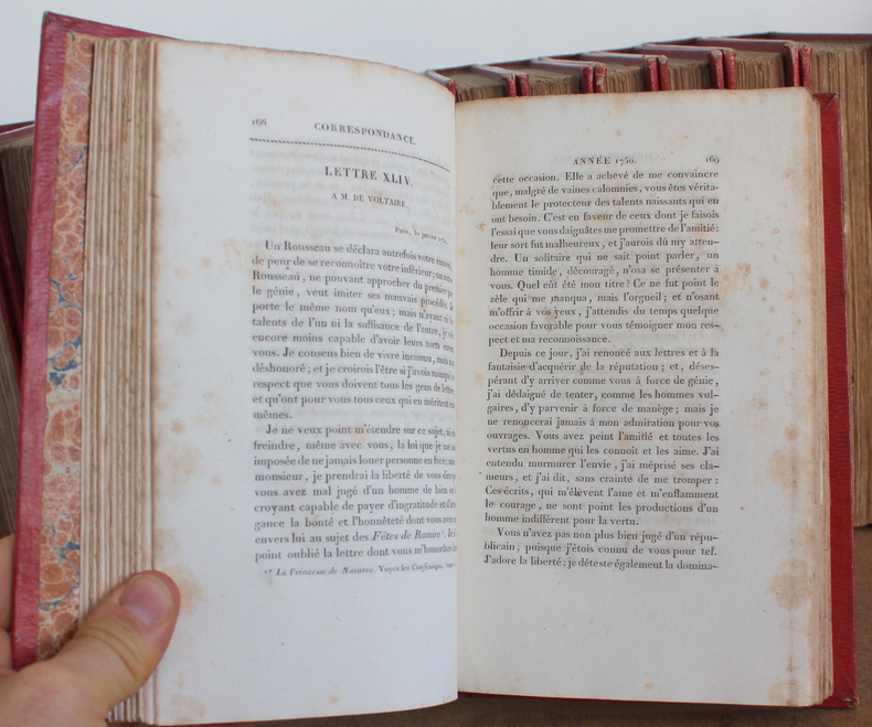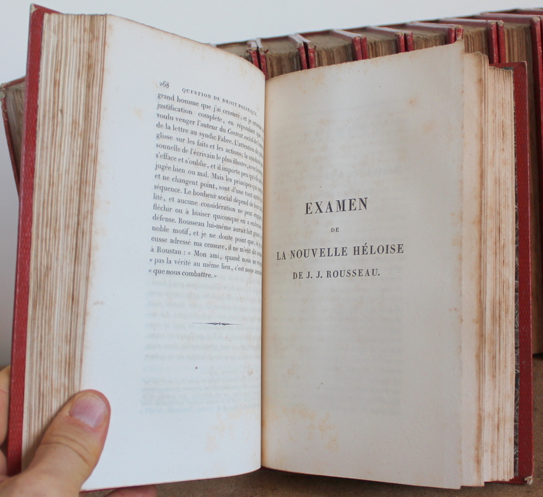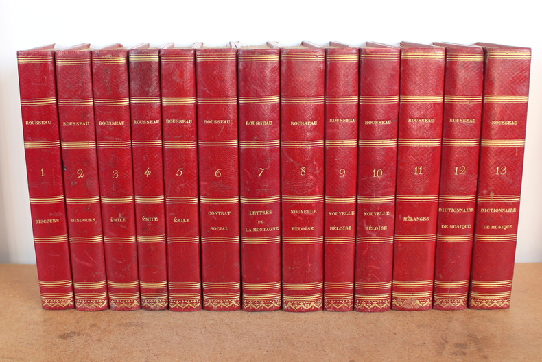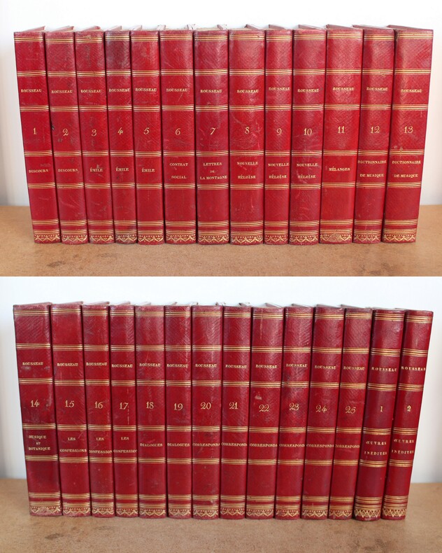 Oeuvres complètes de J. J. Rousseau avec des éclaircissements et des notes historiques, 25 tomes + 2 tomes d’œuvres inédites de J. J. Rousseau chez Baudouin Frères, Libraires en 1826. Seconde Édition. Les livres sont illustrés d'un Frontispice. Les livres mesurent 14x22 cm et pèsent 20 kg (c) pour 400 à 600 pages par volume. Reliure d'époque cartonnée. Les livre sont en état d’usage, très bon, rousseurs éparses.