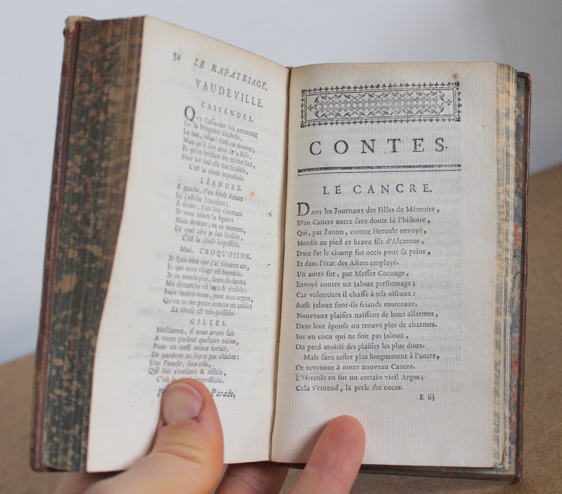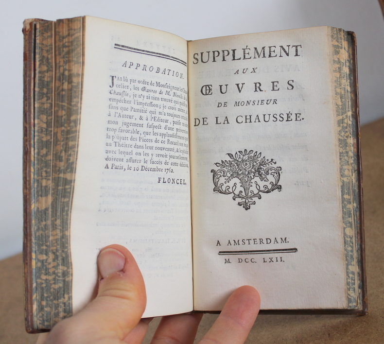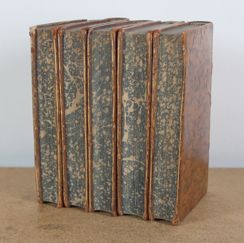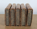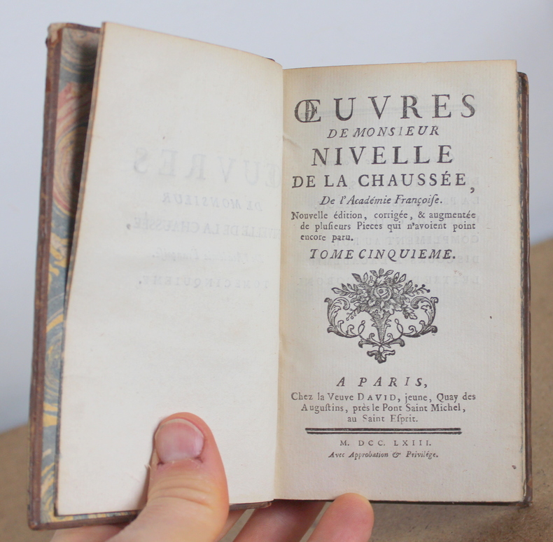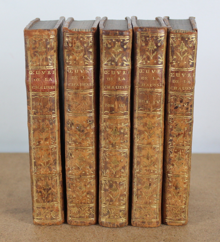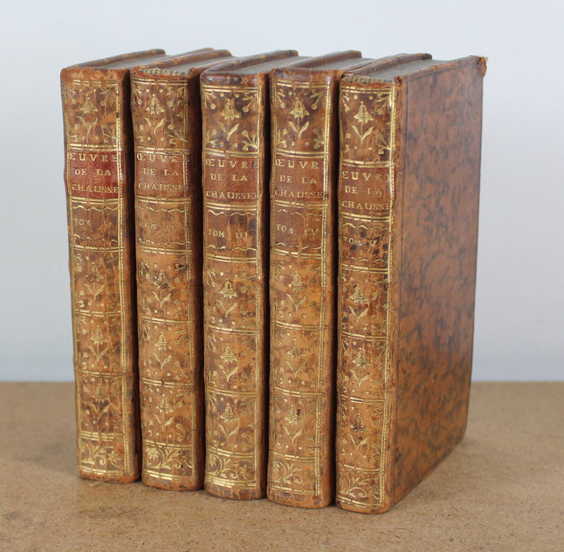 Oeuvres de monsieur Nivelle de la Chaussée, 5 tomes COMPLET de Nivelle de la Chaussée chez la Veuve David en 1763/2. Les livres mesurent 9x15 cm et pèsent 1,000 kg (c) pour 354 400 391 373 215+93 pages. Reliure d'époque cartonnée. Les livre sont en état d’usage, très bon, deux coiffes hautes manquantes, un coin frotté.
