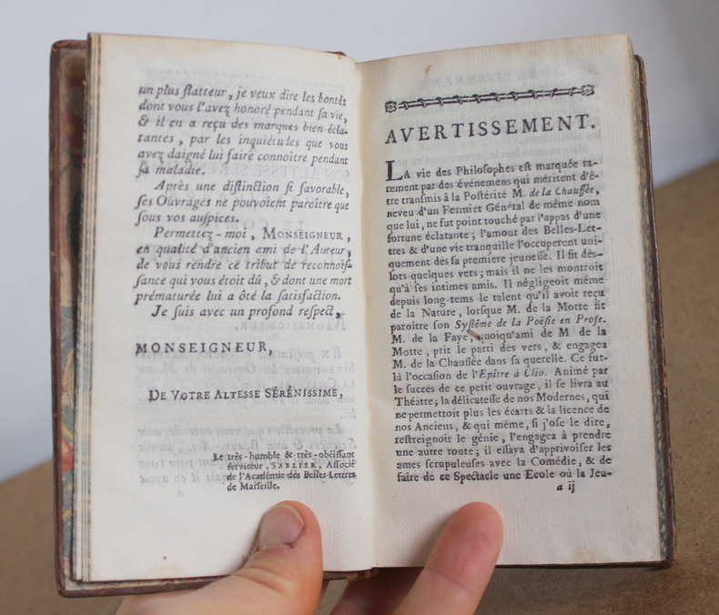 TOME PREMIER : LA FAUSSE ANTIPATHIE. Cette Pièce, en trois Actes, avec le Prologue & la Critique, qui font deux espèces de petites Comédies à part, fut jouée pour la première fois le 12 Octobre 1733. Elle n'eut d'abord que quatre représentations, parce qu'on alla à Fontainebleau; mais à fa reprise, le 27 Février de l'année suivante, avec fa Critique, elle en eut encore quinze; en tout dix-neuf représentations. LE PRÉJUGÉ A LA MODE, en cinq Actes. Cette Comédie, jouée le 3 Février 1735, eut vingt représentations, & fut reprise avec la même réussite le 13 Décembre de la même année. L'ÉCOLE DES AMIS, Comédie en cinq Actes, jouée le 26 Février 1737, eut douze représentations, & fut interrompue au plus fort de son succès par l'indisposition d'un Acteur. TOME SECONDE : MAXIMIEN, Tragédie, mise au Théâtre le 28 Février 1738, eut vingt-deux représentations. MÉLANIDE, Comédie, en cinq Actes, donnée le 12 Mai 1741, eut seize représentations. AMOUR POUR AMOUR, Comédie, en trois Actes, avec un Prologue & un Divertissement, jouée le 16 Février 1742, eut treize représentations. L'Auteur la dédia à Mademoiselle Gauffin, fous le nom de Zémire, qui est son principal personnage. L'ÉCOLE DES MERES, Comédie; en cinq Actes, donnée le 27 Avril 1744, eut treize représentations. Elle fut reprise le 9 Décembre de la même année, & eut encore treize représentations. TOME TROISIÈME : LE RIVAL DE LUI-MÊME, Comédie, en deux Actes, eut un faible succès, Elle fut jouée le 20 Avril 1746. LA GOUVERNANTE, Comédie, en cinq Actes, donnée le 18 Février 1747, eut dix-sept représentations. Le sujet est tiré d'une aventure véritable arrivée à M. de la Faluere, alors Conseiller au Parlement de Bretagne, & depuis Premier Président de ce Parlement. L'AMOUR CASTILLAN. Cette Pièce fut jouée aux Italiens le 11 Avril 1747. Nota. Toutes les Pie ces ci-dessus ont été imprimées du vivant de l'Auteur. Les Comédies qui suivent ne l'ont point encore été. ÉLISE, ou LA RANCUNE OFFI CIEUSE, Comédie, en un Acte. Cette Pièce a été jouée avec succès fur le Théâtre de Berni. LE VIEILLARD AMOUREUX, Comédie, en trois Actes. Cette Pièce était aussi destinée pour le Théâtre de Berni; l'Auteur travaillait à y faire des corrections, lorsque la mort le surprit. TOME QUATRIEME. PAMELA, Comédie, en cinq Actes, jouée en Novembre 1743. L'Auteur fut sollicité de mettre en action le Roman qui porte le même nom; mais il fut malheureux pour avoir voulu en suivre de trop près le caractère de Paméla. Il la retira dès la première représentation, pour supprimer tout ce qui avait déplu au Public, & y faire des changements considérables, L'ÉCOLE DE LA JEUNESSE, Comédie, en cinq Actes, jouée en 1749, eut huit représentations. On espère que cette Pièce pourra pou gagner à la lecture un peu de ce qu'elle a perdu au Théâtre. L'HOMME DE FORTUNE, Comédie, en cinq Actes, représentée au Château de Belle-vue, en présence du Roi, en Janvier 1751. LE RETOUR IMPRÉVU, Comédie, en trois Actes, représentée par les Comédiens Italiens en Juillet 1756. Cette Pièce, qui a été bien reçue du Public, a été retirée après la troisième représentation, pour la donner dans un temps plus favorable. TOME CINQUIEME. LES TYRINTHIENS, Comédie, en trois Actes. Cette Pièce était destinée pour Les Italiens. LA PRINCESSE DE SIDON, Tragi-Comédie, en trois Actes. Elle avait été faire pour la Cour. ÉPITRE DE CLIO. Cet Ouvrage, le premier qui ait fait connaître l'Auteur, parut en 1733, & eut quatre éditions de fuite. COMPLIMENT AU ROI, sur sa Convalescence. DISCOURS A L'ACADÉMIE. On ajoutera, pour terminer ce Volume une Traduction de la Lettre de M. RICCOBONI à M. MURATORI, fur la Comédie de L'ÉCOLE DES AMIS. Et un Supplément aux Oeuvres : LE RAPATRIAGE, Comi-Parade. CONTES : Le Cancre,La Clémentine,il y a,L'origine de la Barbe,Le Roi Hugon,La Linote de Jean XXII, L'origine de la Fofſfette du menton,Le Vila de l'Amour,L'Aventure du Bois de Boulogne.