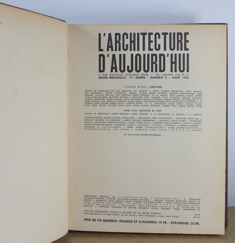 Reliure L'architecture d'aujourd'hui 1936, Revue mensuelle de André Bloc et Collectif chez L'architecture d'aujourd'hui en Août à décembre 1936, 7eme année. Le livre est illustré de nombreuses photographies, figures, dessins, deux plans dépliantes.. Le livre mesure 25x32 cm et pèse 5,700 kg (c) pour 98 94 88 94 113 pages. Reliure d'époque cartonnée, couvertures non conservées. Le livre est en état d’usage, très bon, dos frotté.