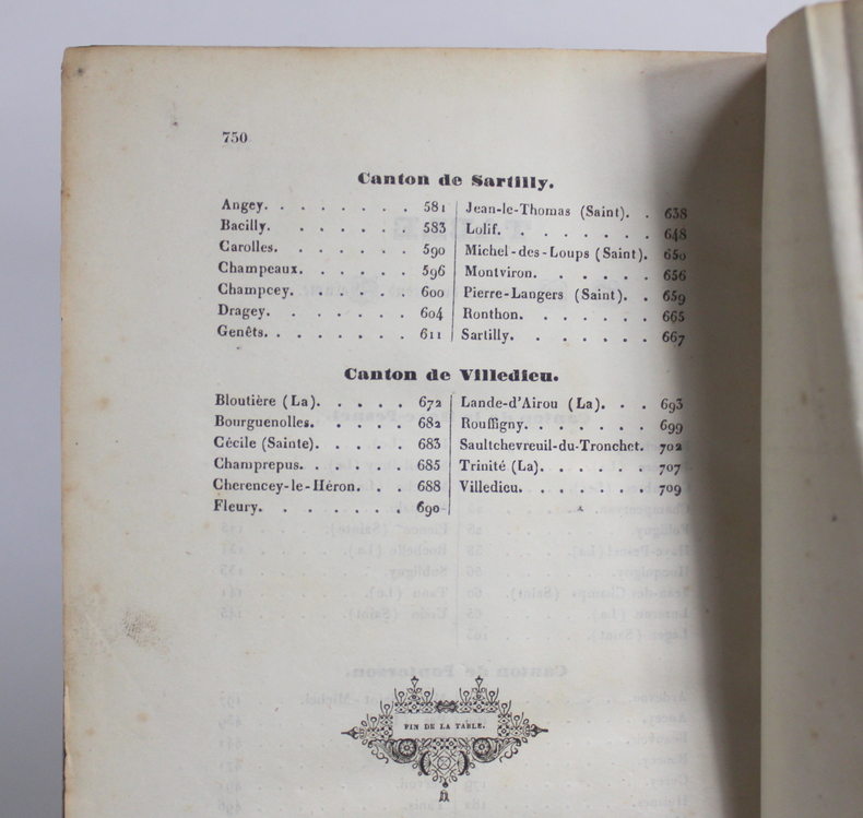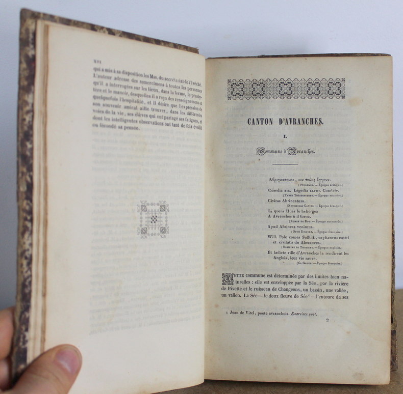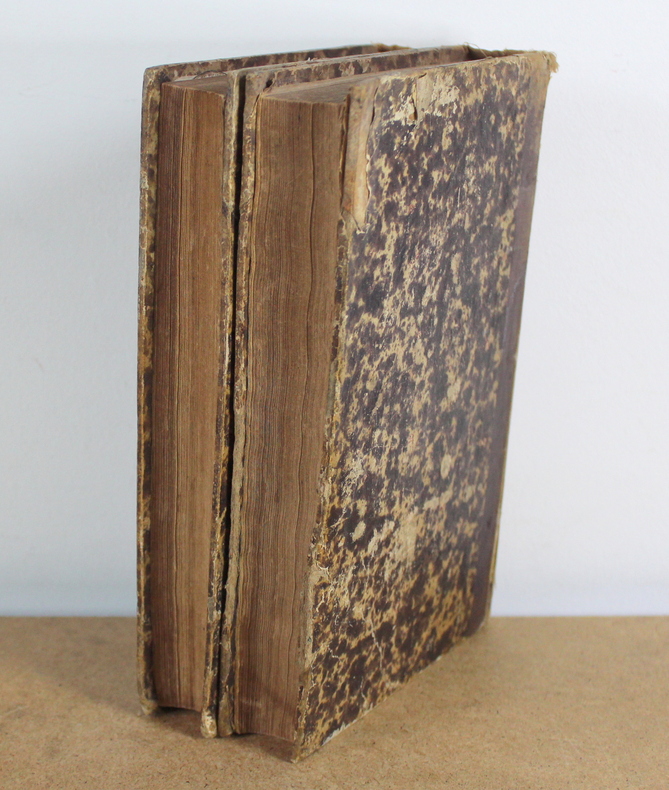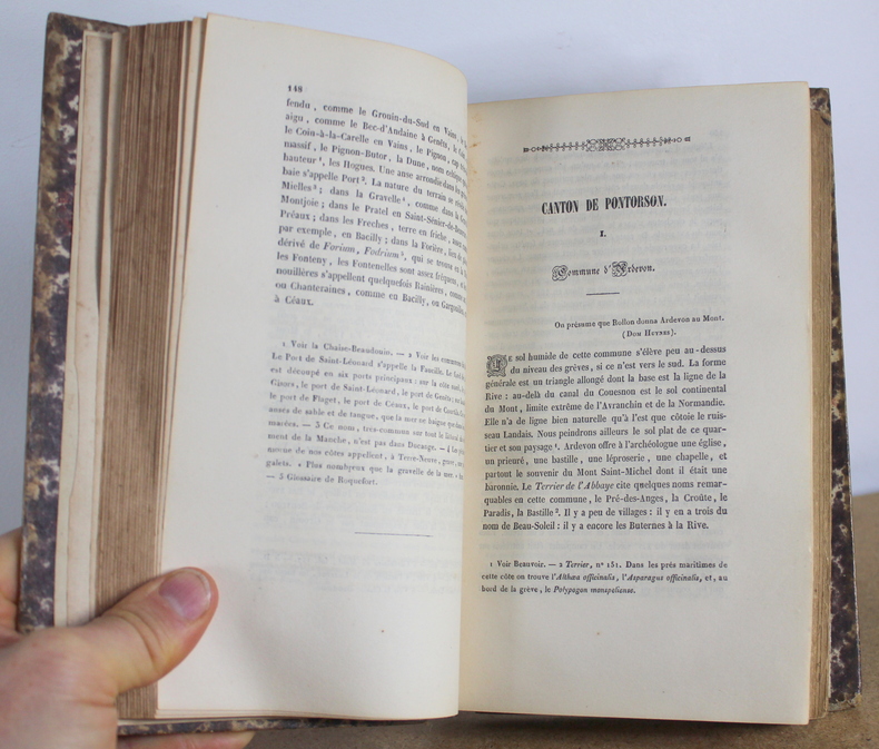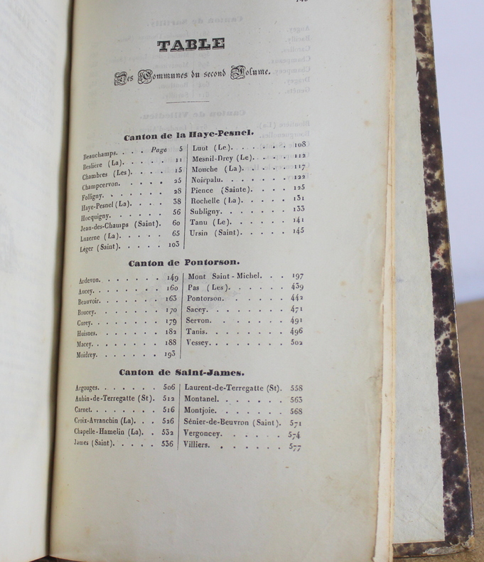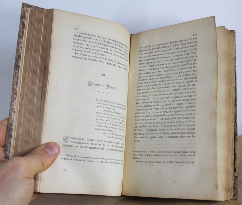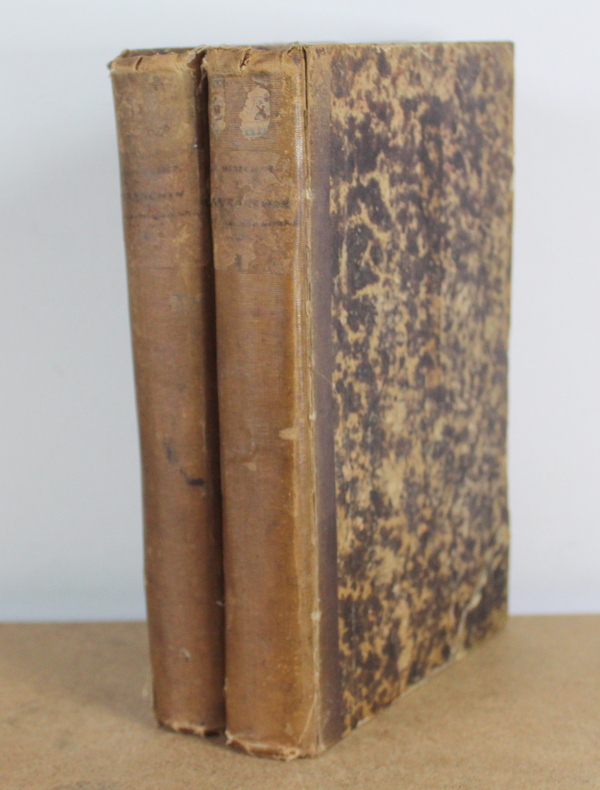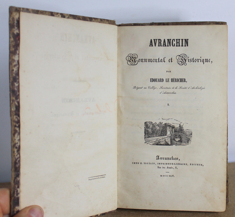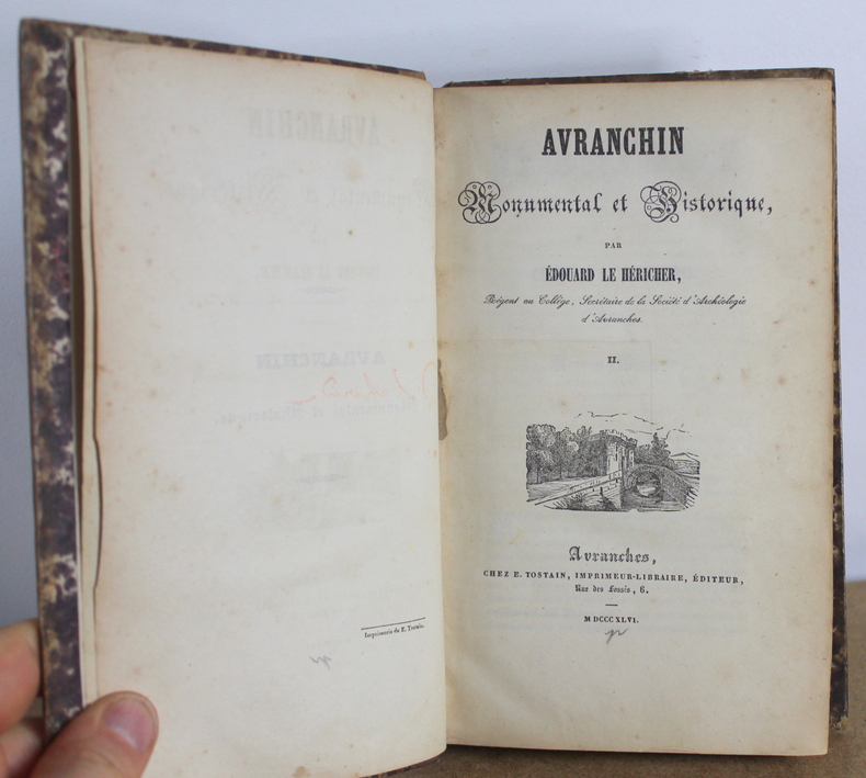 Avranchin Monumental et historique, Tome 1 et 2 COMPLET de Édouard Le Héricher chez E. Tostain Imprimeur-Libraire, Éditeur en 1846. Les livres mesurent 14x22 cm et pèsent 1,500 kg (c) pour 654 750 pages. Reliure d'époque cartonnée. Les livre sont en état d’usage, bon, quatrième de couverture du deuxième volume tient sur un lien, gauchi, coiffes tapées, à restaurer.