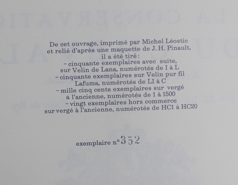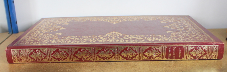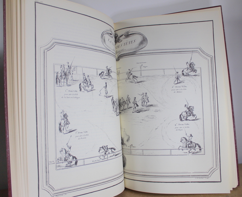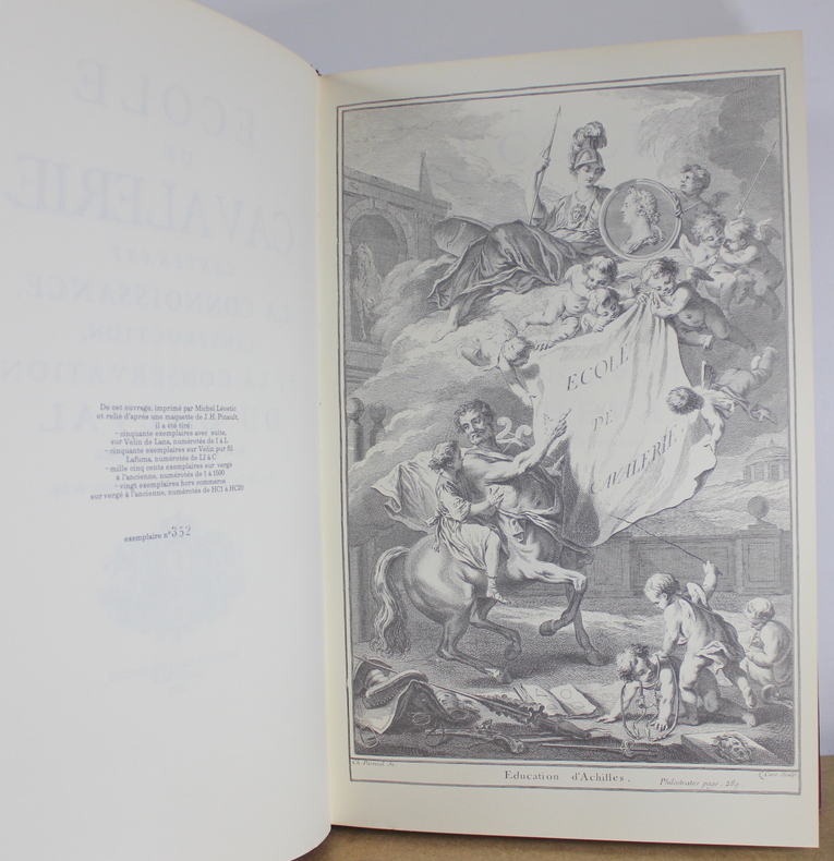 École de cavalerie Contenant la connoissance, l'instruction, et la conservation du cheval de M. de la Guerinière, Écuyer du Roy aux Éditions des 4 seigneurs en 1973. Édition numérotée 352/1500 sur vergé à l'ancienne. Le livre est illustré de Figures en Taille-douce. Le livre mesure 29x45 cm et pèse 3,100 kg (c) pour 276 pages. Reliure d'éditeur cartonnée, maquette de J.H. Pinault. Le livre est en état d’usage, très bon, 3/4 accrocs sur le dos, mors fragiles.