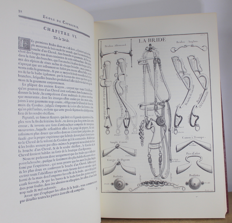 Cette édition peu courante reprend les précédentes, toutefois les belles gravures par Adam, sont entièrement nouvelles, et les cavaliers qui y sont représentés, sont tous en costumes militaires du début du XIXe siècle (Hussards, dragons, lanciers etc.), qui préfigurent les tenues de la cavalerie du 1er Empire. le tome II est consacré aux maladies et remèdes du cheval, il contient également le Traité des haras (Mennessier de La Lance II, 28). L'ouvrage est illustré d'un portrait de l'auteur gravé en frontispice, et 32 planches, dont 4 dépliantes, (lLes noms et la situation des parties extérieures du cheval, les Maladies du cheval, le squelette du cheval, et la course des têtes ). Notons que la planche 29 bis, "course des têtes" n'est pas numérotée. Les autres planches sont numérotées de 1 à 31.François Robichon de La Guérinière, (1688-1751) fut un des plus grands écuyer français, et l'un des principaux maître de l'école française.