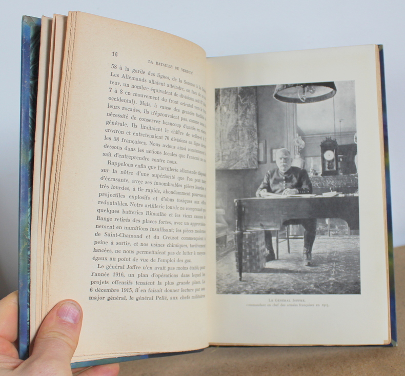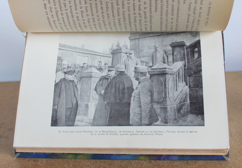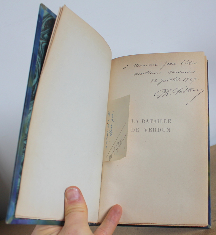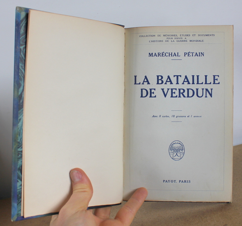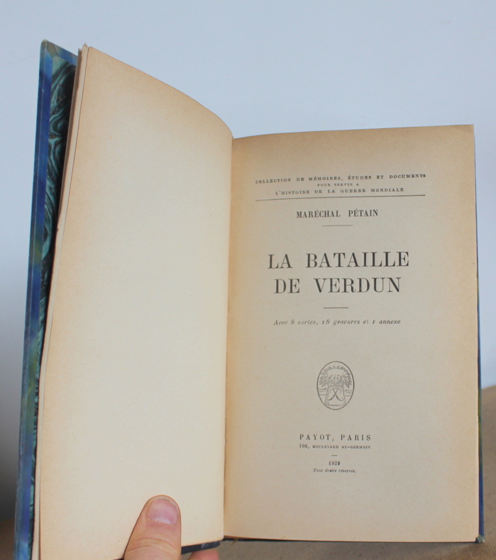 La bataille de Verdun du Maréchal Pétain chez Payot Collection de mémoires, études et documents pour servir à l'histoire de la guerre mondiale en 1929. Deuxième édition postérieure de quelques jours à l'édition originale imprimée également en Février 1929. Hommage du Maréchal. Le livre est illustré de 8 cartes, 18 gravures et une annexe. Le livre mesure 15x23 cm et pèse 0,600 kg (c) pour 156 pages. Reliure d'époque cartonnée. Le livre est en état d’usage, très bon, mors frottés.