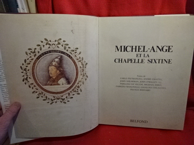 Paris, Belfond, 1986 ; in-4, 272 pp., reliure d'éditeur pleine toile rouge, dos lisse, sous jaquette illustrée et emboitage. Intervenants : André Chastel, John Shearman, John O'Malley, Pierluigi de Vecchi, Michel Hirst, Fabrizio Mancinelli, Gianluigi Colalucci. Photographies de Takashi Okamura.