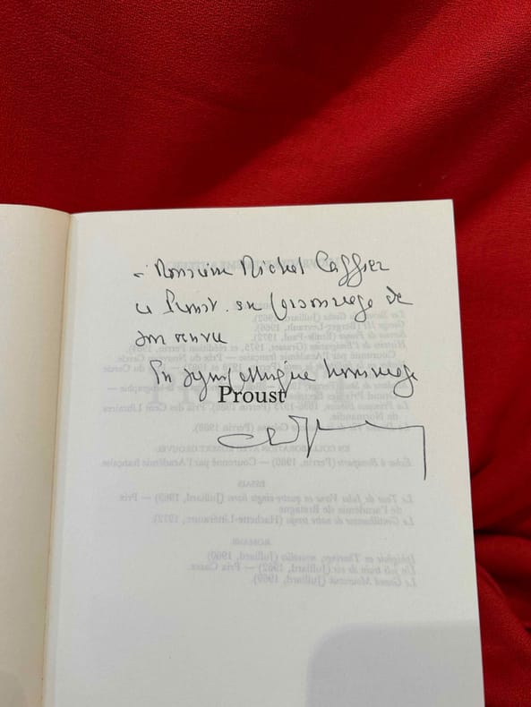 Précieuse lettre originale signée Marcel Proust. Cette lettre, adressée à une dame, lui demande d'intervenir auprès de Pierre Lafitte, rédacteur en chef de l'Excelsior. Proust voudrait faire précéder l’article le concernant, rédigé à sa demande par son ami Jean Cocteau, Buste, d'un chapeau “court et simple”, qu’il a rédigé et déjà envoyé à Dominique Sylvaire. À condition toutefois que ledit chapeau n’ait pas pour effet que l’article ne passe “en moins bonne place”. Proust et Cocteau se sont rencontrés en 1910 chez Geneviève Strauss (veuve du compositeur de Carmen). L'article de Jean Cocteau, auquel fait référence Proust, fut publié en bonne place dans la rubrique La Galerie des bustes de l'Excelsior le 23 novembre 1913, neuf jours après la publication de Du côté de chez Swann (14 novembre 1913). “Du côté de chez Swann ne ressemble à rien que je sache et me rappelle tout ce que j’admire. C’est le cousinage des chef-d’œuvres.”, “une miniature géante, pleine de mirages, de jardins superposés, de jeux entre l’espace et le temps, de larges touches fraîches à la Manet” (Jean Cocteau, extraits de l’article). Proust “agent littéraire”. Loin de l’image du Proust écrivain en retrait du monde et désintéressé, on découvre ici le Proust “pragmatique, stratège, organisant tactiquement la publicité autour de ses livres, veillant à leur bonne diffusion, surveillant de près le discours journalistique les concernant, tel un véritable ‹‹ agent littéraire ›› avant la lettre et, moins attendu peut-être, un Proust au moins aussi soucieux de sa médiatisation personnelle que celle de ses livres” (Leriche) Françoise Leriche, "Proust, un sens publicitaire aigu". Bulletin d'informations proustiennes No. 48 (2018), pp. 81-91.