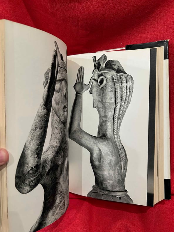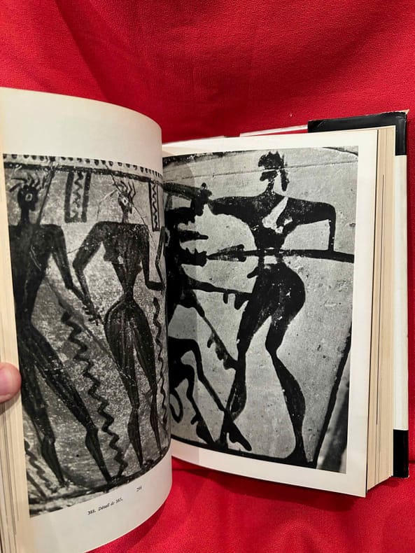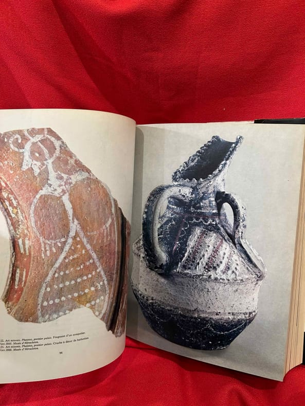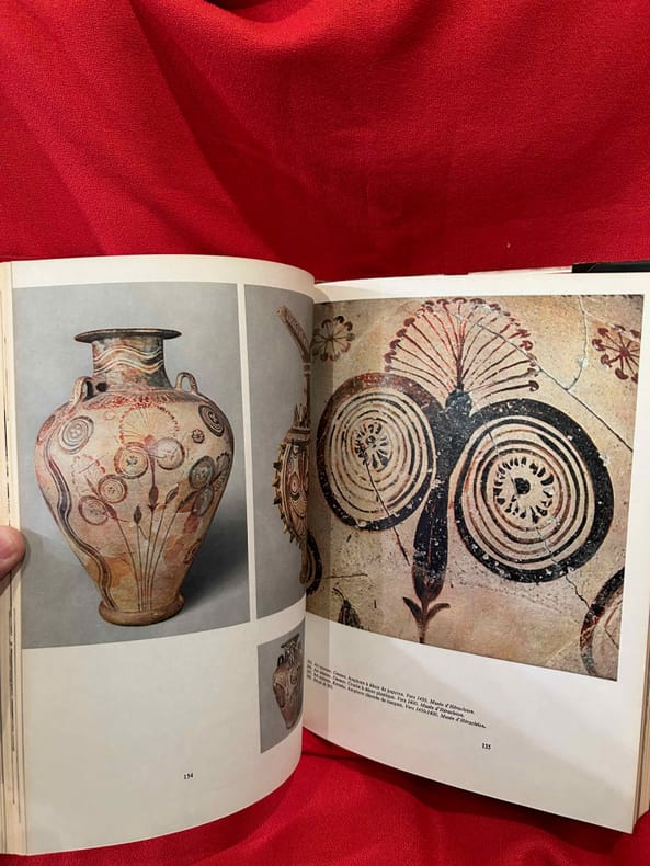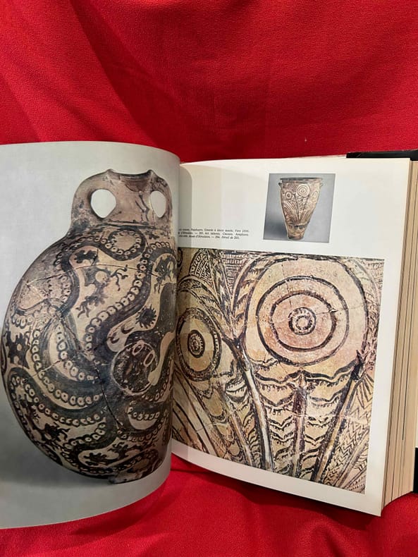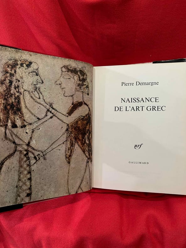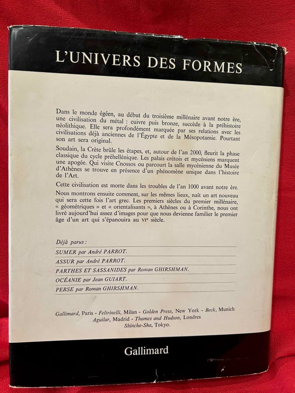 Paris, Éditions Gallimard, 1964 ; in-4, 8-456 pp. + cartes, reliure d'éditeur pleine toile estampée imprimée rouge vif, dos lisse, sous jaquette illustrée. Collection «l'Univers des Formes» dirigée par André Malraux et Georges Salles. Pierre Demargne est professeur d'archéologie classique, directeur du CNRS, et maitre de conférence. Il dirige de nombreuses fouilles, de 1927 à 1962. Ce livre traite de l'émergence de l'art égéen, grec et chypriote. Mil ans avant l'art hellénique. Très nombreuses illustrations dont certaines en couleurs. Très bon état.