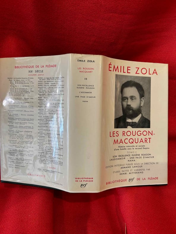 Paris, Gallimard, La Pléiade, 1961 ; in-12, 1748 pp., reliure d'éditeur plein cuir bleu marine, dos lisse, jaquette, Rodhoid et emboitage. Son Excellence Eugène Rougon ; L'Assommoir ; Une page d'amour ; Nana. Édition intégrale publiée sous la direction de Armand Lanoux. Études, notes et variantes par Henri Mitterand.