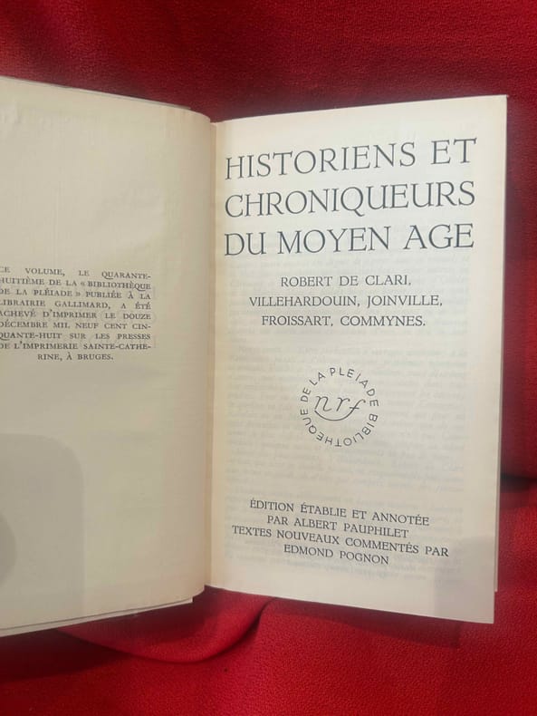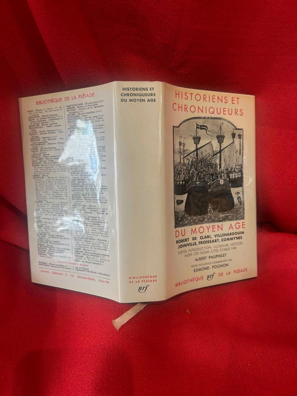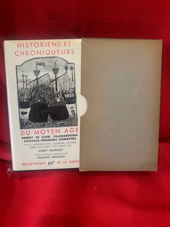 Paris, Gallimard, La Pléiade, 1952 ; in-12, 1537 pp., reliure d'éditeur plein cuir, coloris violet, sous jaquette, Rhodoïd et emboitage, tête peinte en gris. Bibliothèque de la Pléiade, volume N° 48. Edition établie et annoté par Albert Pauphilet. Textes nouveaux commentés par Edmond Pognon. Ce volume contient des textes de : Robert de Clari, Villehardouin, Joinville, Froissart, Commynes. Bon état.