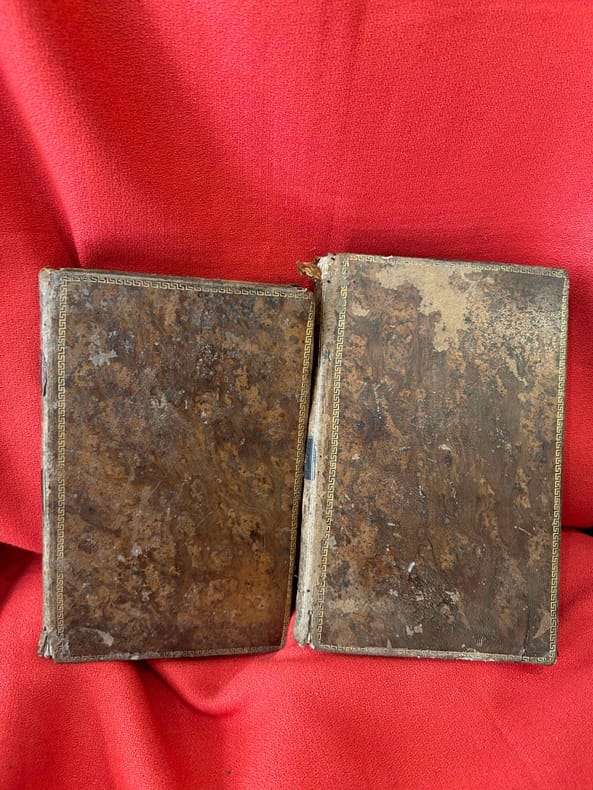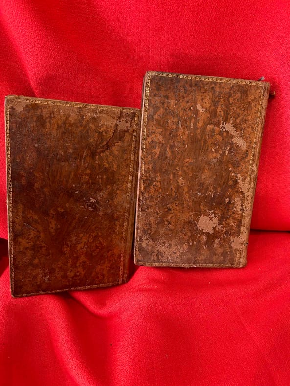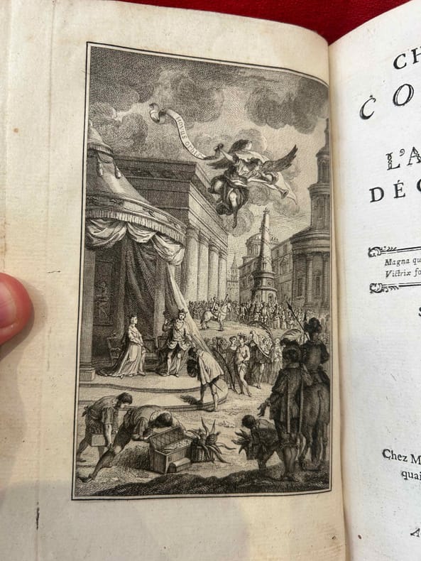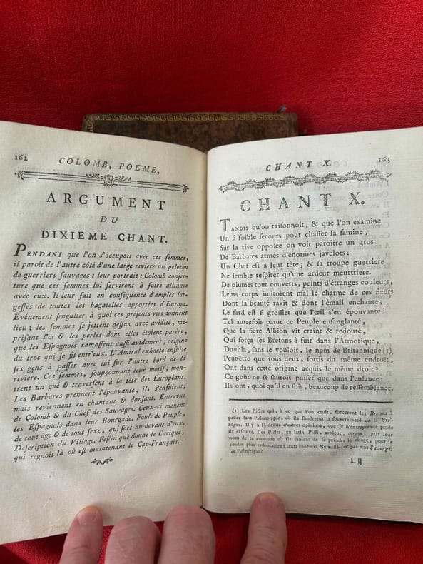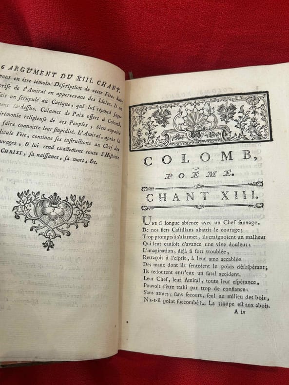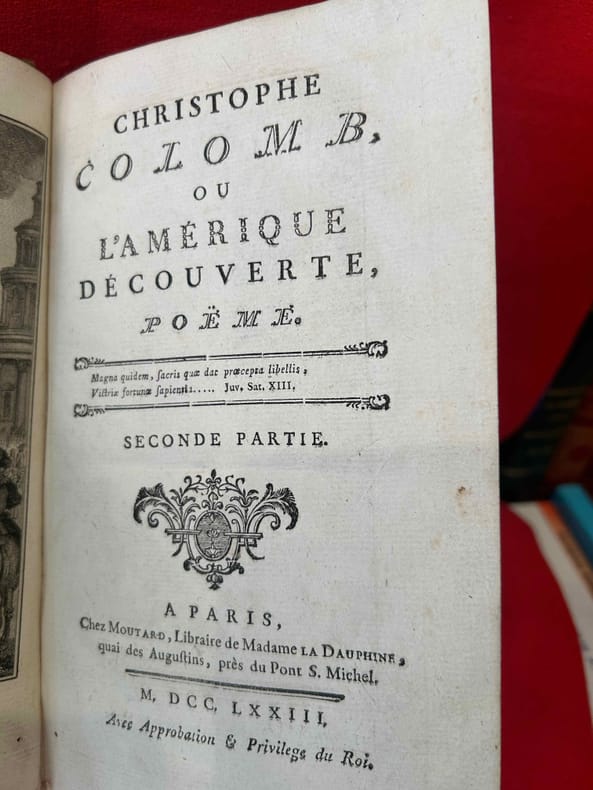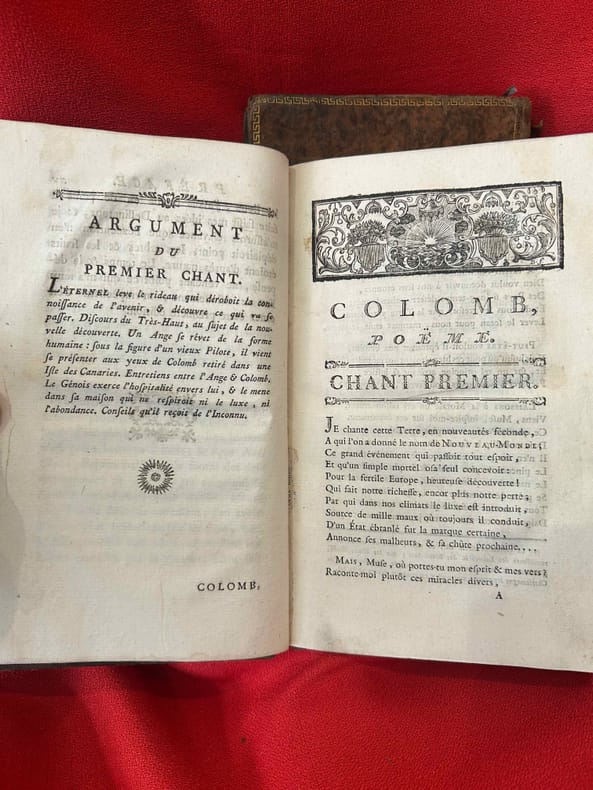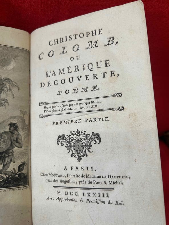 Paris Moutard 1773 2 vol. Relié 2 vol. in-8, plein veau fauve marbré, dos lisses ornés de fleurons dorés, pièces de titre et de tomaison de maroquin rouge et vert, armes dorées sur les plats supérieurs, tranches rouges, XV + 217 et 266 pp. Edition originale de ce poème épique en 24 chants, illustrée de deux beaux frontispices allégoriques. Natif de La Rochelle où il présida l'Académie des belles lettres, sciences et arts, l'auteur (1710-1776) s'établit à Saint Domingue où il fut secrétaire de la Société d'agriculture du Cap français. Petites galeries de vers et épidermures sur les plats n'affectant pas les armes dorées, ex-libris gravé du marquis de Lajudie.