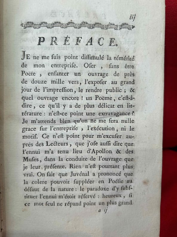 Paris, Chez Moutard, 1773 ; in-8, XVI-217 + 268 pp., reliures plein veau marbré, dos lisse ornés, pièce de titre en maroquin rouge et de tomaison en maroquin noir, tranches jaspées, filets sur les plats. Les 2 volumes. Frontispices de Challe grés par Tilliard. Édition originale. Texte divisé en 24 chants.