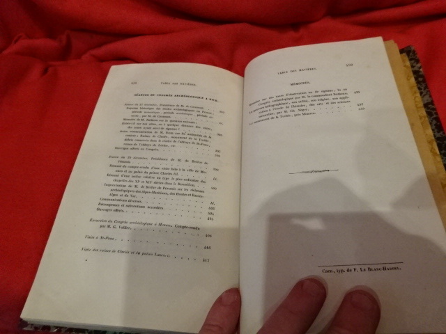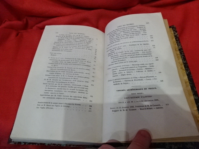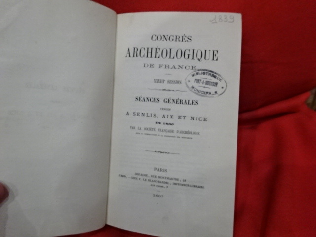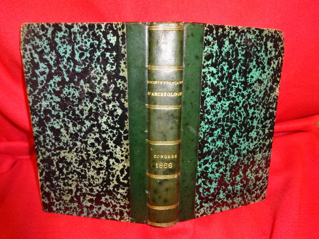 Paris / Caen, Derache / F. Le Blanc-Hardel, Imprimeur-Libraire, 1867 ; in-8 (139 x 216 mm), LXVIII-460 pp. + 3 pl. dépliantes hors-texte, relié demi-cuir, coloris vert foncé, dos lisse orné de filets dorés, tranches jaspées. Séances générales tenues à Senlis, Aix et Nice en 1866, par la Société française d'Archéologie. Nombreuses illustrations en noir et blanc.