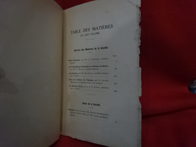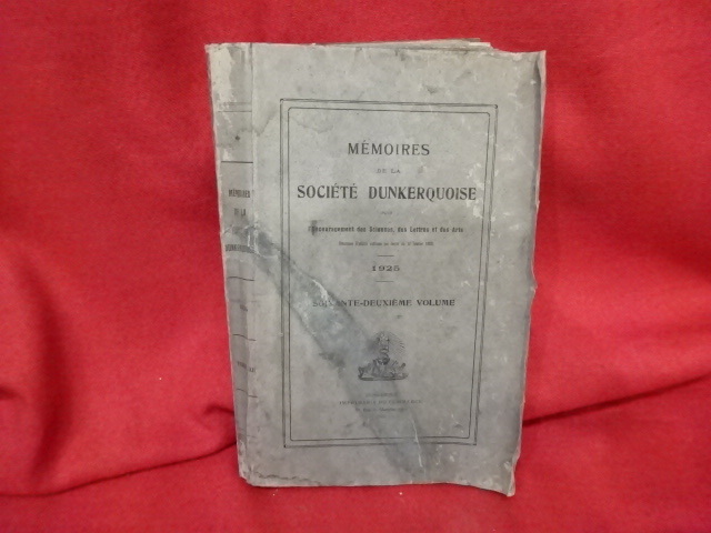 Dunkerque, Imprimerie du Commerce, 1925 ; in-8 (142 x 225 mm), 200-LXXII pp., broché (couverture en mauvais état). Sommaire: M. A. LESMARIES, membre titulaire: Émile Bouchet; M. G. MORAEL, membre titulaire: la Colonisation française en Afrique du Nord; M. Jean DURIAU, membre titulaire non résidant: les Pigeons; M. Georges MARGUERIT, membre titulaire non résidant: Dans les Griffes du Vautour; Dr G. DURIAU, président de la Société: le Dernier Relai. Actes de la Société: Mlle Madeleine ISORÉ, secrétaire-adjointe: Rapport sur les travaux de la Société dunkerquoise pendant l’année 1924, conférences de 1924-1925, procès-verbaux des séances de 1925, liste des membres de la Société, Sociétés correspondantes.