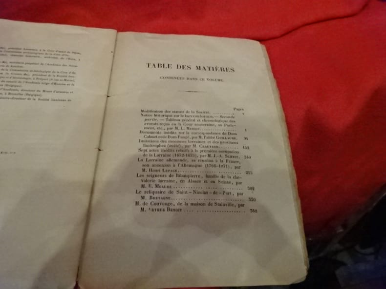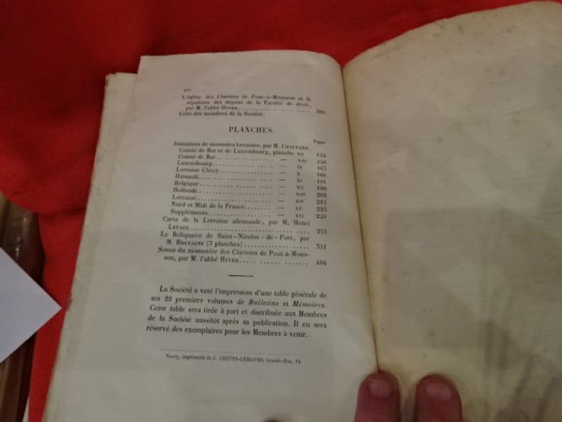 Nancy, Imprimerie de G. Crépin-Leblond, 1873 ; in-8, 406-XVI pp. + 15 pl. hors-texte, dérilé (à faire relier). Sommaire: Modification des statuts de la Société, p. V./ Louis MENGIN: Notice historique sur le barreau lorrain. – Seconde partie – Tableau général et chronologique des avocats reçus en la Cour souveraine, au Parlement, etc., p. 1./ abbé Pierre-Étienne GUILLAUME: Documents inédits sur la correspondance de Dom Calmet et de Dom Fangé, p. 94./ J. CHAUTARD: Imitations des monnaies lorraines et des provinces limitrophes (suite), p. 152./ Joseph-Alexandre SCHMIT: Sept actes inédits relatifs à la première occupation de la Lorraine (1632-1635), p. 240./ Henri LEPAGE: La Lorraine allemande, sa réunion à la France, son annexion à l'Allemagne (1766-1871), p. 255./ Édouard MEAUME: Les Seigneurs de Ribaupierre, famille de la chevalerie lorraine, en Alsace et en Suisse, p. 302./ Alexandre-Marie-Auguste BRETAGNE: Le Reliquaire de Saint-Nicolas-de-Port, p. 330./ ARTHUR BENOIT: M. de Couvonge, de la maison de Stainville, p. 368./ abbé HYVER: L’Église des Claristes de Pont-à-Mousson et la sépulture des doyens de la Faculté de droit, p. 382./ Liste des membres de la Société (paginé I à XVI), p. 407. –Planches:J. CHAUTARD: Imitations des monnaies lorraines: Comté de Bar et de Luxembourg, planche VII, p. 154; Comté de Bar, planche VIII, p. 156; Luxembourg, planche IX, p. 163: Lorraine Chiny, planche X, p. 166: Hainault, planche XI, p. 181; Belgique, planche XII, p. 190; Hollande, planche XIII, p. 203; Lorraine, planche XIV, p. 215; Nord et Midi de la France, planche XV, p. 223; Suppléments, planche XVI, p. 228./ Henri LEPAGE: Carte de la Lorraine allemande, p. 255./ BRETAGNE: Le Reliquaire de Saint-Nicolas-de-Port (3 planches), p. 351./ abbé HYVER: Sceau du monastère des Claristes de Pont-à-Mousson, p. 404.