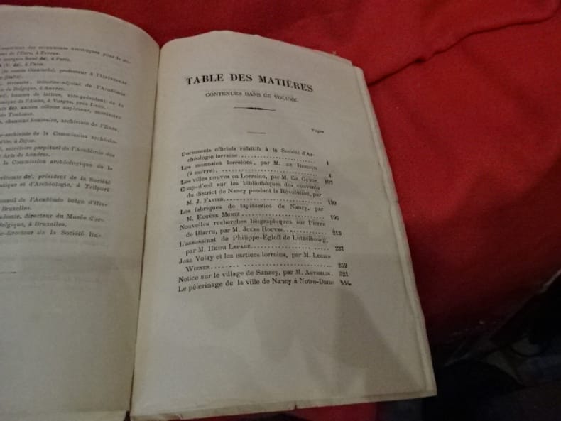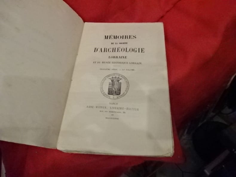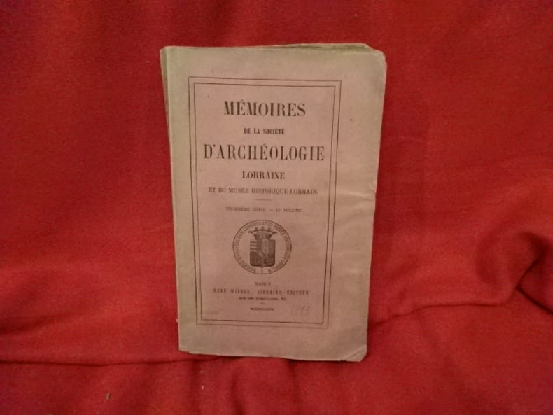 Nancy, René Wiener, Libraire-Editeur, 1883 ; in-8, XIV-406-XXIV pp. + 10 pl. hors-texte, dérelié (à faire relier). Sommaire: Documents officiels relatifs à la Société d'Archéologie lorraine, p. 1./ comte E. Du Bois de RIOCOUR: Les Monnaies lorraines (à suivre), p. 1./ Charles GUYOT: Les Villes neuves en Lorraine, p. 107./ Justin FAVIER: Coup-d’oeil sur les bibliothèques des couvents du district de Nancy pendant la Révolution, p. 139./ Eugène MUNTZ: Les Fabriques de tapisseries de Nancy, p. 195./ Jules ROUYER: Nouvelles recherches biographiques sur Pierre de Blarru, p. 213./ Henri LEPAGE: L’Assassinat de Philippe-Egloff de Lutzelbourg, p. 237./ Lucien WIENER: Jean Volay et les cartiers lorrains, p. 259./ E.-L. AUTHELIN: Notice sur le village de Sanzey, p. 321./ Léon GERMAIN: Le pèlerinage de la ville de Nancy à Notre-Dame de Benoîte-Vaux, en 1642, p. 336./ Alexandre-Marie-Auguste BRETAGNE: Laraire antique trouvé à Naix, p. 370./ Henri LEPAGE: Les globes de Jean L'Hoste, p. 377./ Liste des Sociétés savantes avec lesquelles la Société d'Archéologie échange ses publications, p. 401./ Liste des publications qui sont envoyées à la Société, p. 405./ Liste des membres de la Société (paginé I à XXIV), p. 407. –Planches: Cartes de Jean Papin et Jean Volay, p. 262./ Enveloppe de tarots de Nicolas Humblet, p. 282./ Cartes de Michel Feriet, p. 263./ Cartes de Jean Hemau, p. 275./ Cartes de Jean Odibert, p. 279./ Cartes de Jean-Pierre Odibert, Lamoureux, Leclerc, Bertrand, p. 292./ Carte du village de Sanzey et des environs, p. 321./ Autel de Laraire trouvé à Royaumeix, p. 370./ Laraire antique trouvé à Naix, p. 373./ Les globes de Jean L’Hoste, p. 376.