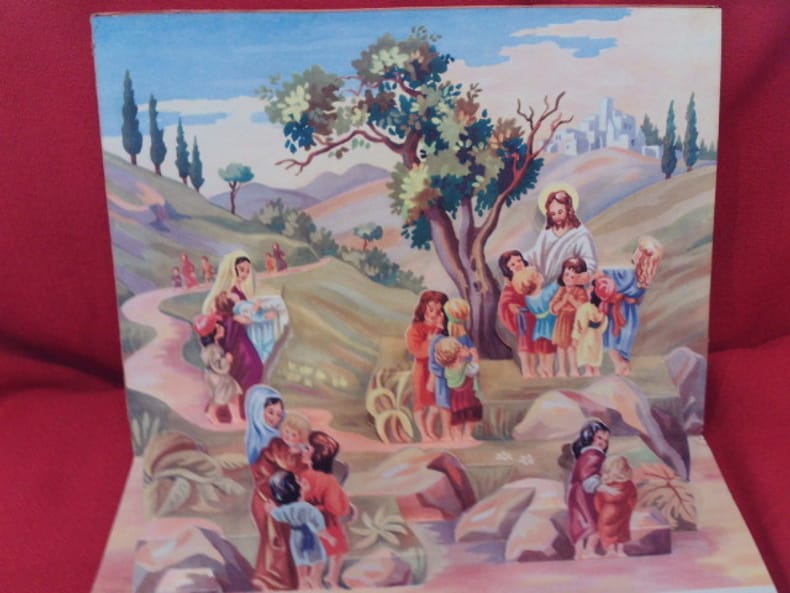 Mulhouse, Éditions «Lucos », s.d. (vers 1930) ; in-4 oblong 269 x 197 mm, 8 vues en relief, broché, couverture illustrée, dos muet. Album pop-up en 7 feuilles cartonnées. Illustrations en couleurs.