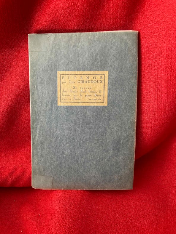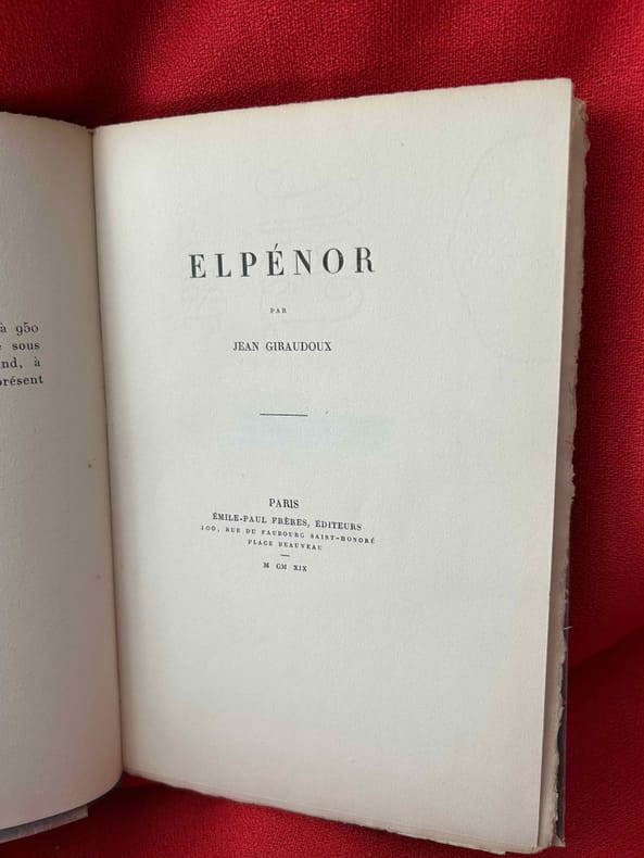 1927 GIRAUDOUX Jean : Elpénor. La tradition de l’intelligence Paris 1927. E.O. L’un des 100 ex. sur Vélin, quatrième papier. Broché in-8, couverture jaunie et piquée, intérieur frais –