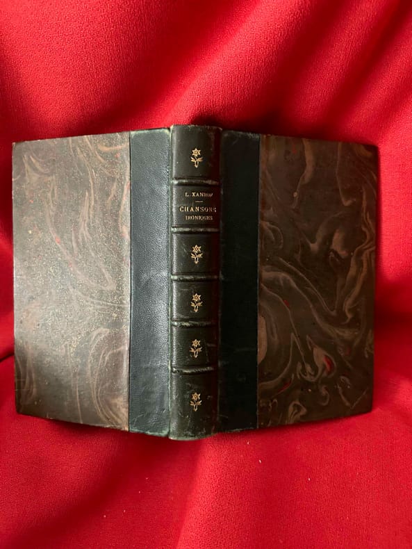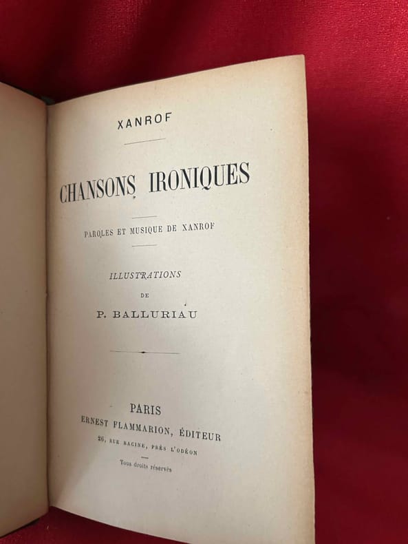 Paris Flammarion sans date (vers 1900) In-12, bradel demi-percaline marron à coins, plats de papier marbré (reliure de lépoque).Edition originale, réunissant 30 chansons composées (paroles et musique) par Léon Xanrof, un des chansonniers les plus populaires de Montmartre à la fin du XIXe siècle. L'ouvrage est illustré par P. Balluriau de nombreux dessins à pleine page et in texte. Chaque chanson est accompagnée de sa partition musicale. Le tirage sur grand papier a été limité à 15 exemplaires sur japon impérial. Exemplaire du tirage ordinaire.